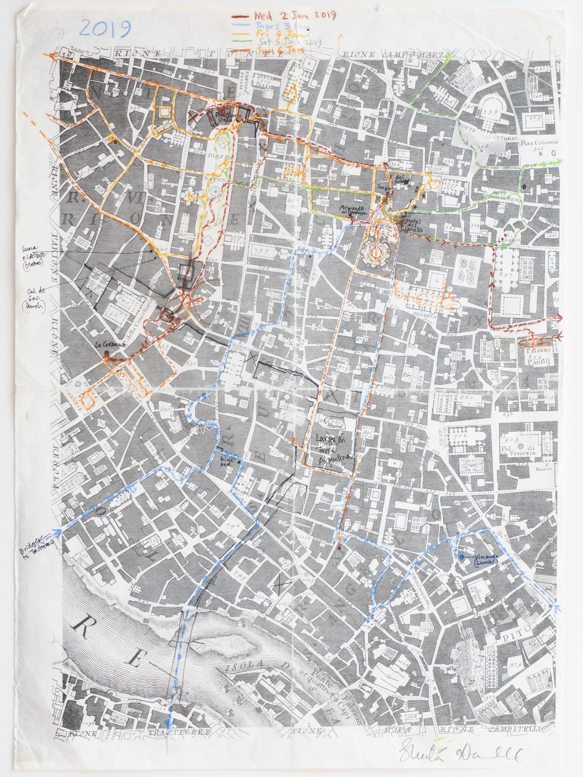 Sheila O’Donnell (1953), drawing over Giambattista Nolli’s Nuova Topografia di Roma, Campus Martius, centro, 2019. Coloured pencil on photocopy, 420 × 297 mm. DMC 3955.1.