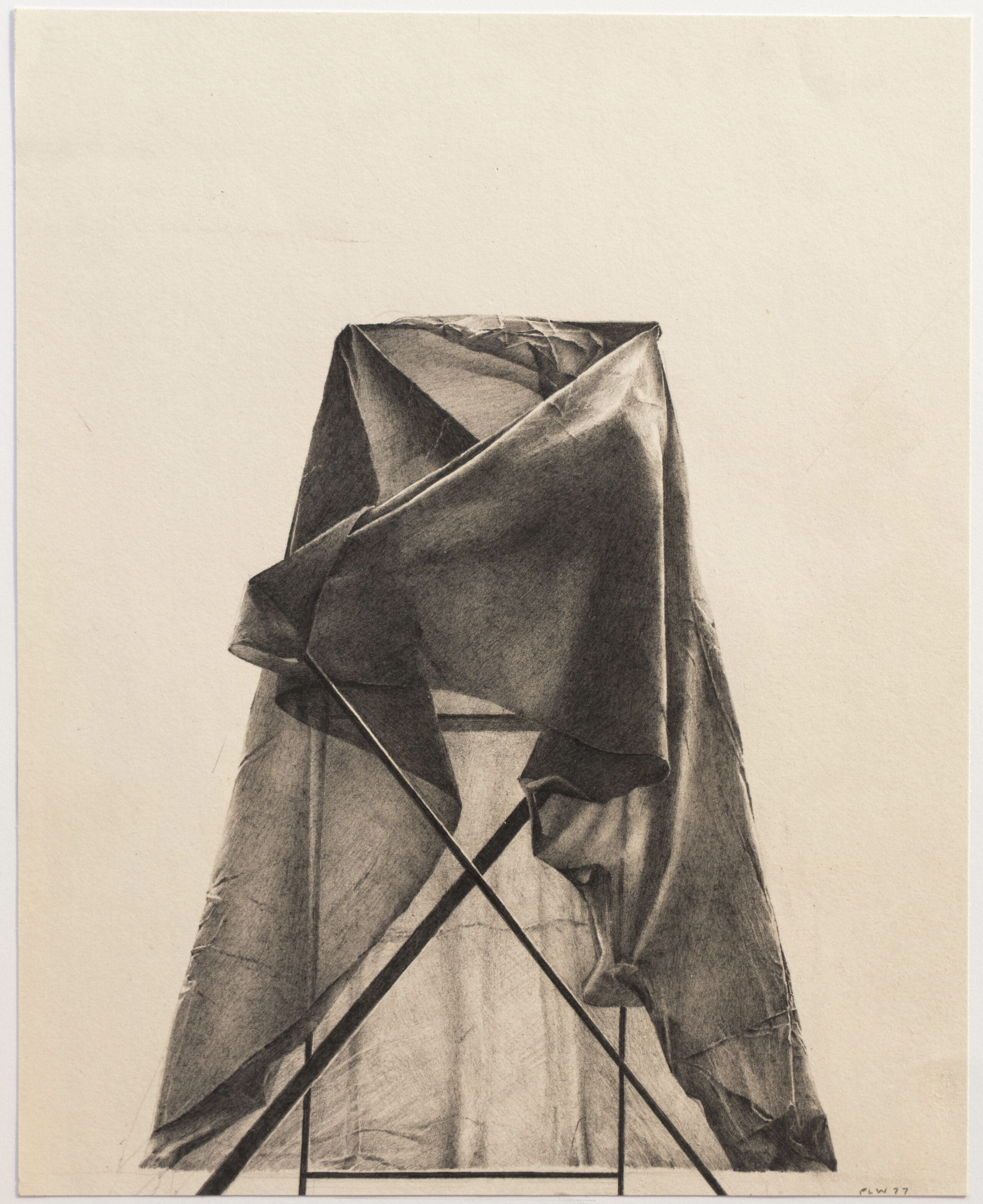 When Peter Wilson’s enchanting curtain drawings arrived at the archive in London, they necessitated a new approach. Any light directed at the drawing reflected off the graphite and flattened its softness and subtlety. It also felt slightly violent, like forcing the drawing to pose for a passport photo or an uncomfortable dental X-ray. To remedy this, I positioned the camera directly above the drawing, turned off all the lights, set the exposure time to 30 seconds, and fired the shutter.