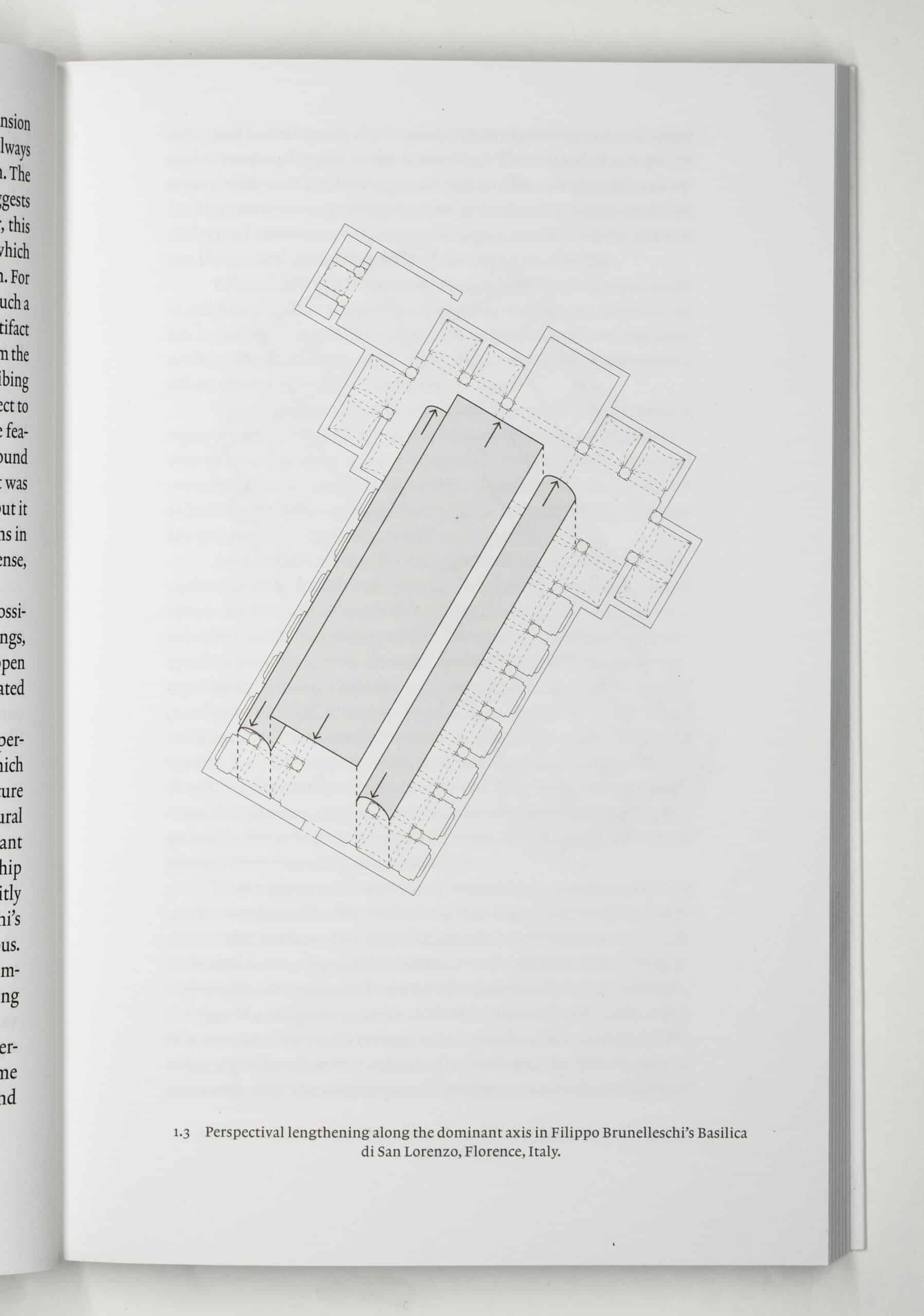 Eisenman begins his analysis, though, not with Alberti, but with Brunelleschi’s projects for the basilicas of Santo Spirito and San Lorenzo, both in Florence. Eisenman’s analytical drawings of the perspectival conditions along the main axes of the naves of both basilicas demonstrate virtuelity.
