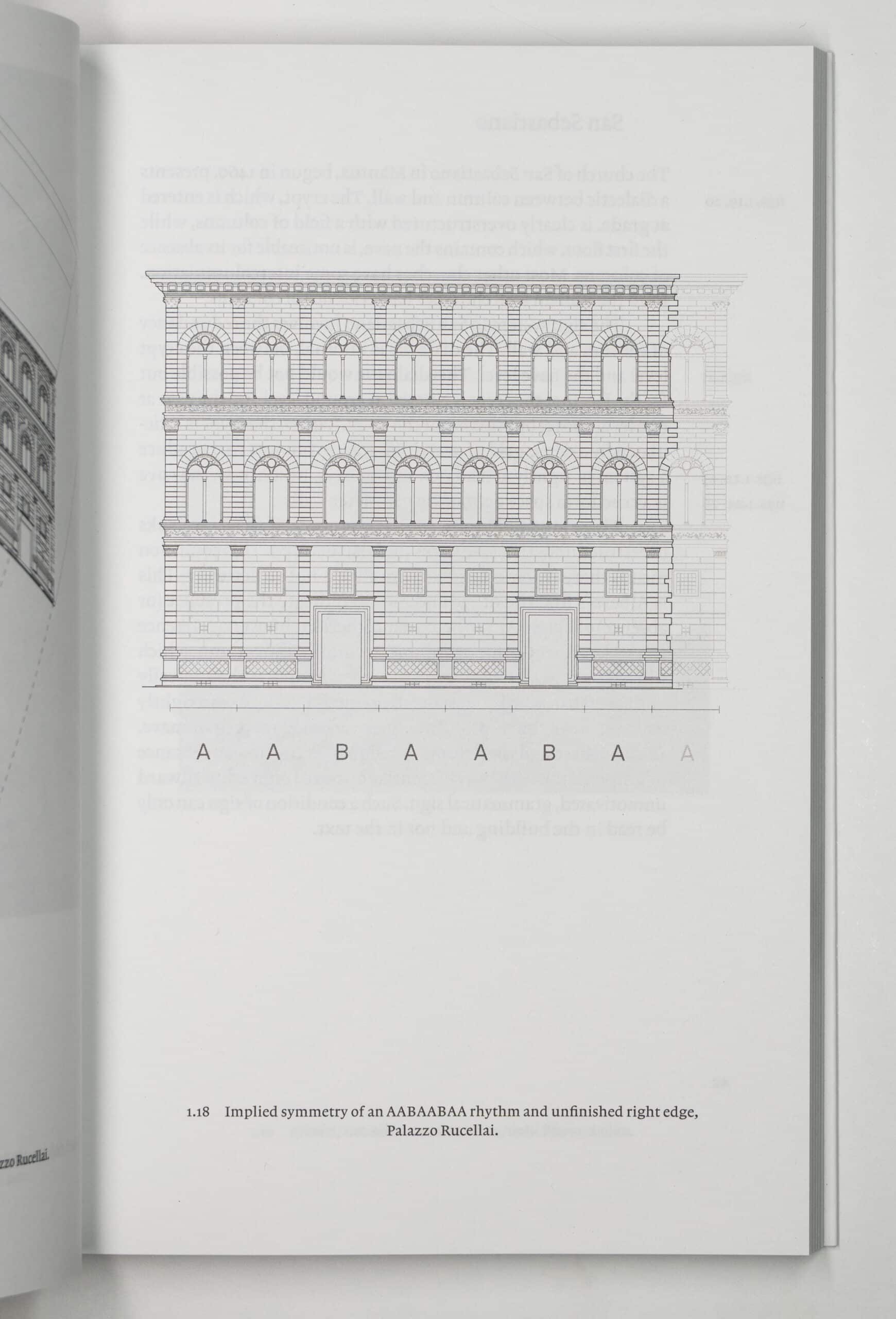 The Palazzo Rucellai evinces the idea of a ‘fragment,’ which Eisenman directly references in connection to Jacques Derrida.[11] Rather than being a supplement to an original whole in real space, or the remainder of one in virtual space (as with the inboard corner pilasters in the Old Sacristy), a fragment questions the idea of a whole altogether, and thus of a part-to-whole harmony. It is the idea of harmony that Alberti introduced in his treatise (which he wrote around the same time that he was working on the Palazzo Rucellai) through the term concinnitas. The destabilization of concinnitas that Eisenman observes in Alberti’s five projects (which also include the Basilica di Santa Maria Novella, the Chiesa di San Sebastiano, the Basilica di Sant’Andrea, and the Tempio Malatestiano), as opposed to Alberti’s writings, makes the former’s book a rewriting of the latter.