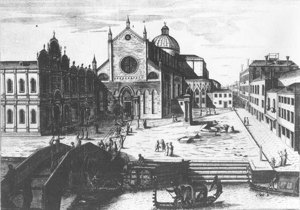 As several critics have pointed out, the shadows in this painting of SS Giovanni e Paolo imply that the sun is high in the north, which never happens.[2] Canaletto cannot have drawn the shadows from life. It looks as though he might have copied them from an engraving of the scene by another artist, Domenico Lovisa (Fig.3). Canaletto’s and Lovisa’s shadow patterns are very similar. There is another engraving of this scene by the older view painter Luca Carlevarijs, in which the lighting is realistic, but the west front of the church is in deep shadow. One can see why Canaletto would have wanted to avoid this.