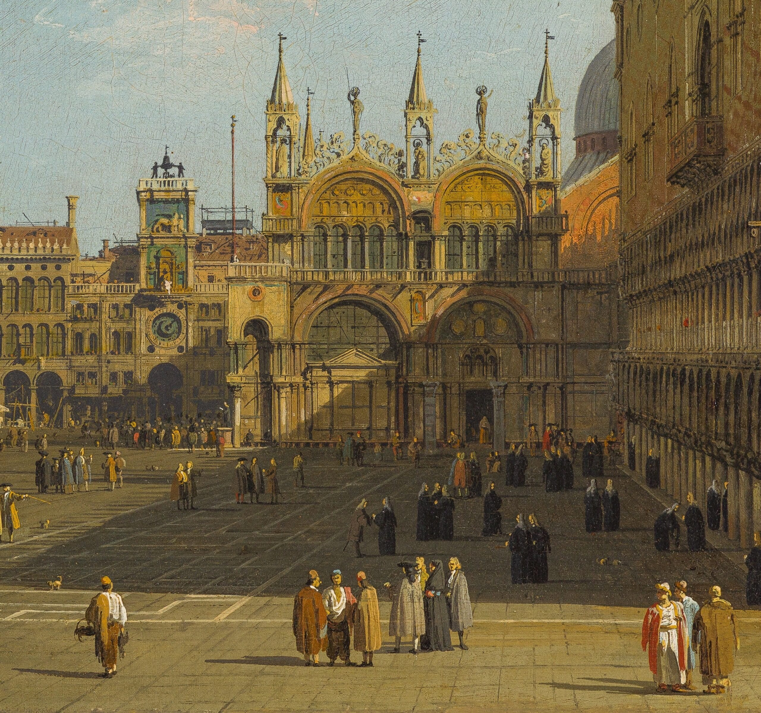 It might seem counterintuitive that the people within the shadow of the Palace should cast shadows on the ground to their right. I think Canaletto has in mind that they are illuminated by the sky from the left. But if the shadows are not cast directly by the sun, then they ought to be more diffuse and spread out. The assumed direction of the sun is again impossible here: it is high in the sky to the east. Sometimes, Canaletto has the sun shining in different directions in the same painting. He uses shadow and sun to draw our attention away from some buildings and towards others that are more important to the composition.