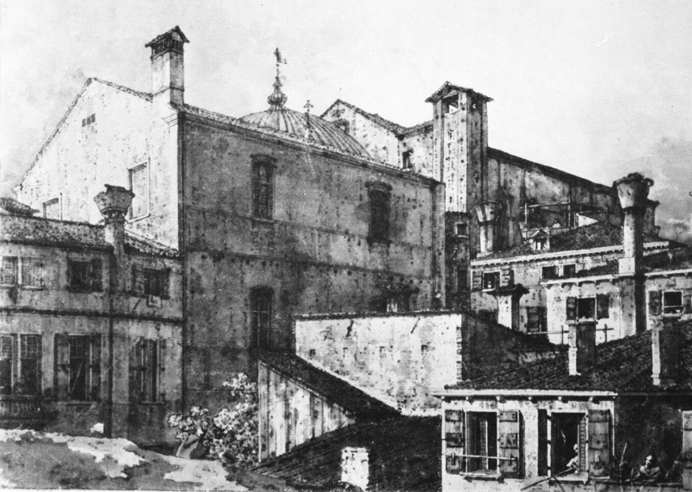 My colleague Gregorio Astengo was able to take a photograph from a position near Canaletto’s viewpoint (Fig.6). Some buildings have been altered. But the photo serves to indicate the accuracy of the drawing. Here, the shadows—for example, those cast by the eaves of the roofs—appear to be observed, not constructed by rule. The single tree is rendered with patches of light and shade, rather than with the looping outlines that Canaletto otherwise uses to indicate foliage in sketches.