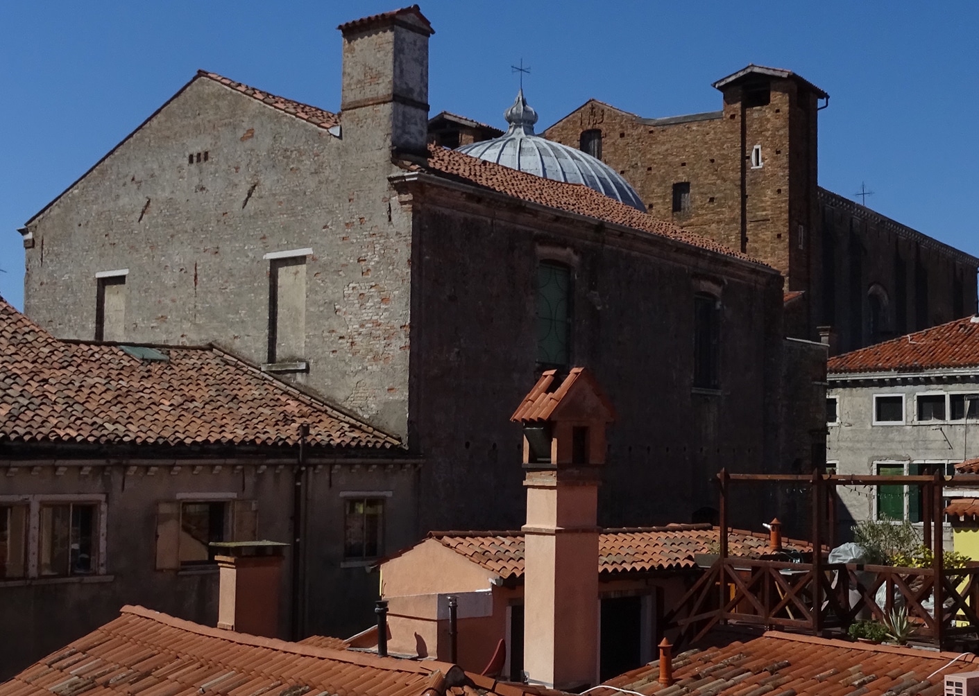 As mentioned, all the drawings in the quaderno are confined to outlines only, and any indication of shadows is very rare. However, Canaletto made a handful of other sketches that look to me very much as though they are camera drawings, but with shading and shadows rendered in tonal washes. Fig.5 is an example: a drawing of buildings outside a window of Canaletto’s house in the district of San Lio, including the church of Santa Maria della Fava with its flattened dome. The Canaletto scholar J G Links has a daydream that the artist might have made this, and another similar drawing, to pass the time when he was ill and confined to his bedroom.[5]