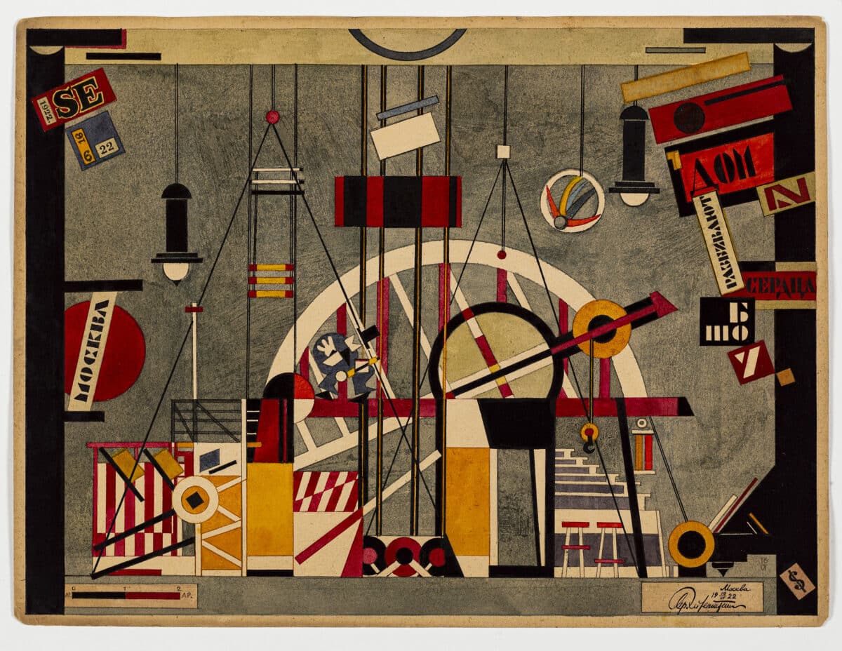 Eisenstein’s designs for the play, of which this drawing is one, abandoned Shaw’s naval theme almost entirely and instead proposed an abstract design in the Russian Constructivist style.[7] (The year before this project, the first exhibition of Constructivist drawings was held in Moscow, titled 5 x 5 = 25). The stage was to include several kinetic elements: two trapeze swings, a trapeze hoop, a lift, and a moving walkway.[8] The design would therefore emphasise automation, mechanisation, and spectacle.