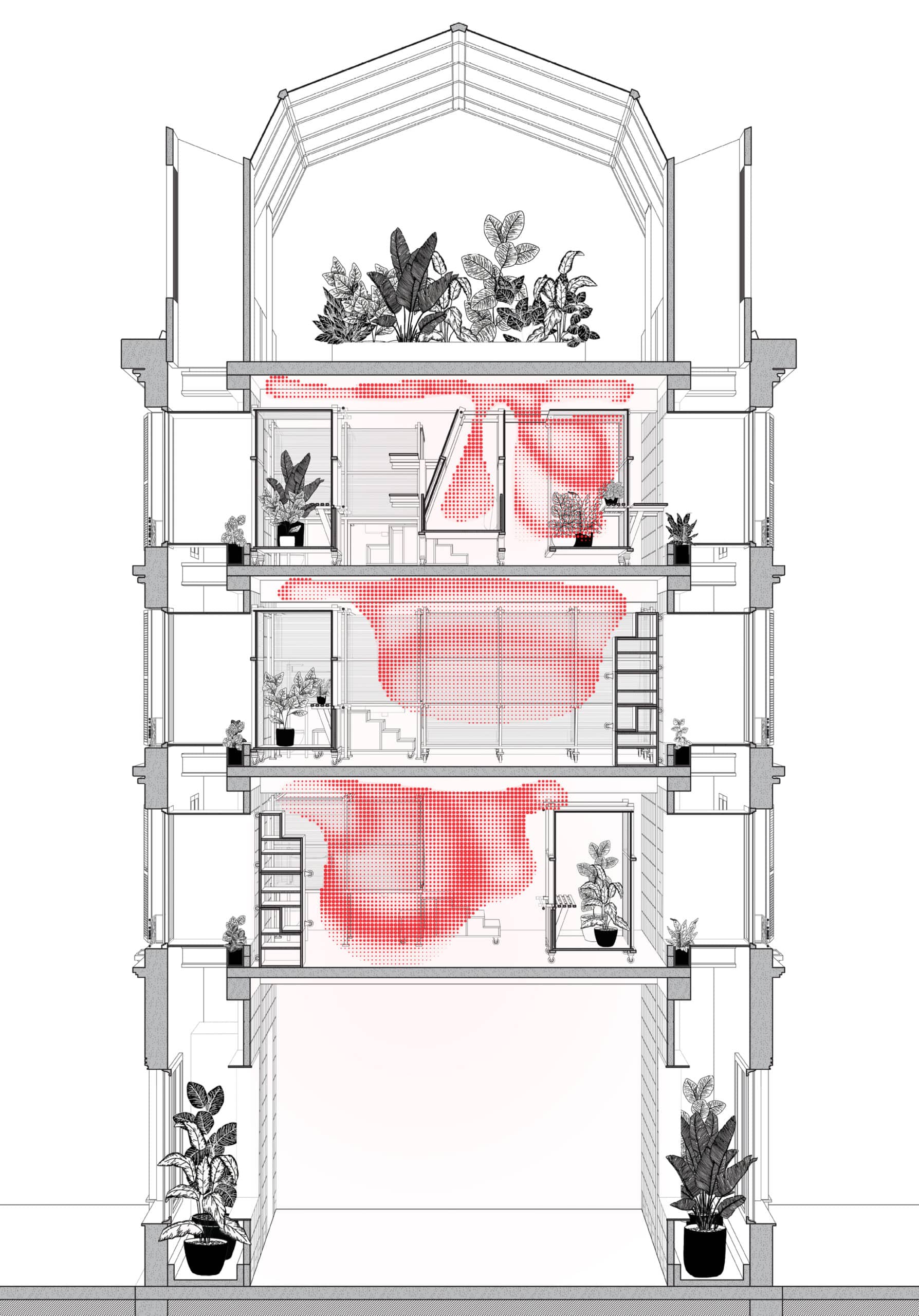 A Newer Domestic Landscape reclaims air from its traditional invisibility and positions its visualisation as a design tool. Seeking to investigate passive strategies of ventilation, the project centres on small-scale interior interventions represented through sectional perspectives. By extrapolating the behaviour of fluids across spaces of varying dimensions and connectivity, airflow is simulated in Grasshopper and subsequently represented through an overlay in the sectional drawings. Sight, a perception shaped by light, hence becomes an operative tool for exploring and communicating the spatial effects of these interventions on environmental design.
