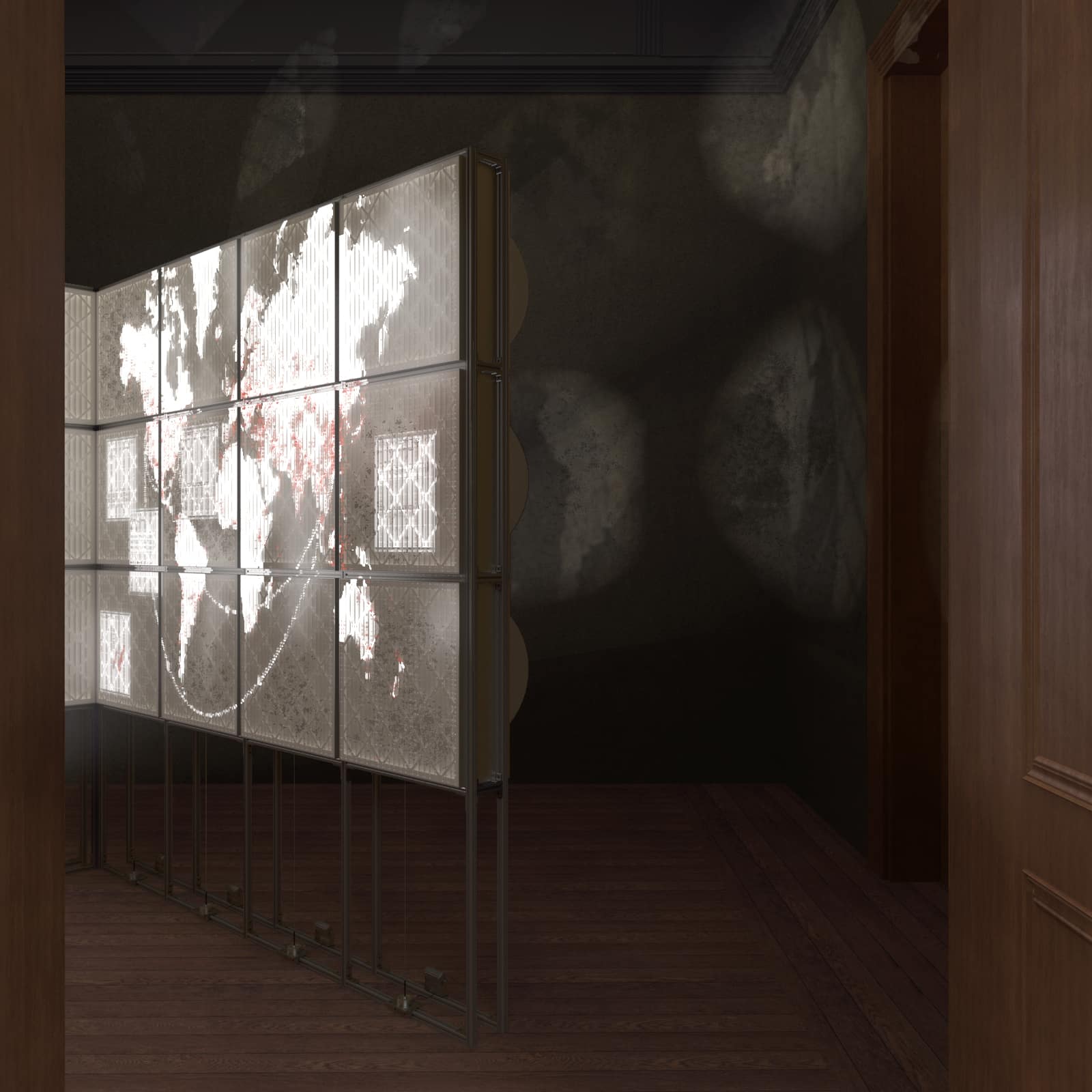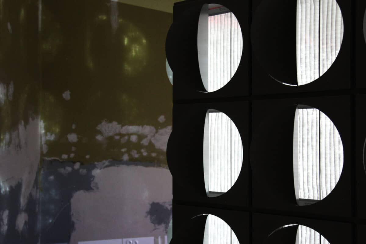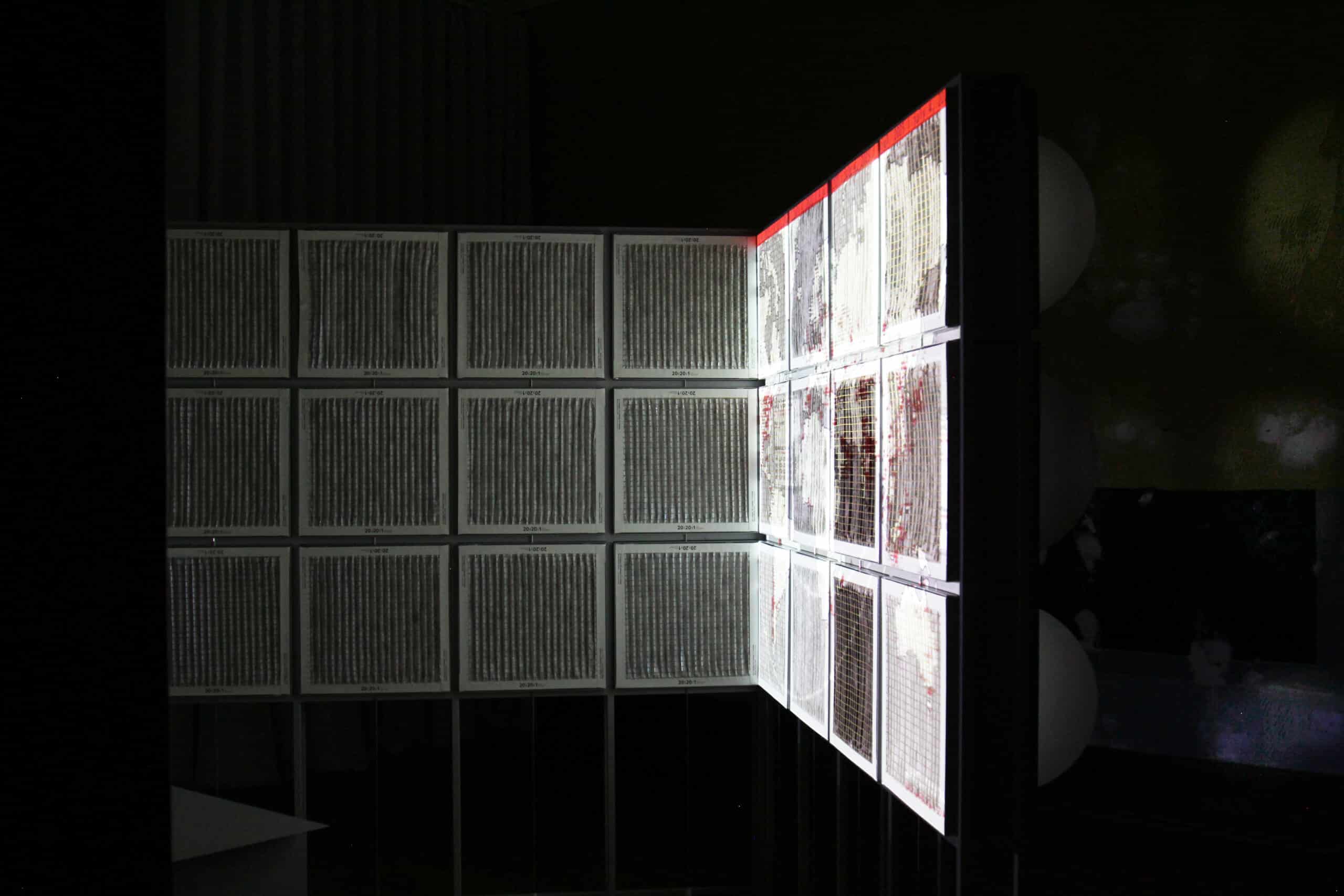 Bruno Latour was enchanted by the construction of linear perspective that—by means of materialising projection—connects two-dimensional figures with three-dimensional objects.[2] Subsequently, he argues that it is in the inscription of sight that mankind attains enlightenment.[3] Following Latour’s observation while activating contemporary technologies, we set out to create three-dimensional drawings that could render air circulation in both dynamic and perceptible forms. We constructed a projection screen through integrating HEPA filters with metal air ducts. Not all filters were new: several were collected from communities worldwide and bore traces of prior use. These filters registered not only particulate matter but also social inequality: the collected pollutants documented air quality along with access to air-handling technologies. A projection system named ‘aerographics’ was then introduced, using the Grasshopper survey as its visual content and the filter screen as its display surface. The system explored the parallel unidirectional movements of air through HVAC structures and of light through projection. It used the filtration of light to visualise the process of air purification. As the projected light passed through filters of varying used conditions, it produced luminous graphics of differing intensities on the gallery wall. This makes perceptible, through light, an atmospheric record of spatial inequities intrinsic to the everyday built environment. In this way, drawing became an operative performance, animating what is otherwise invisible.