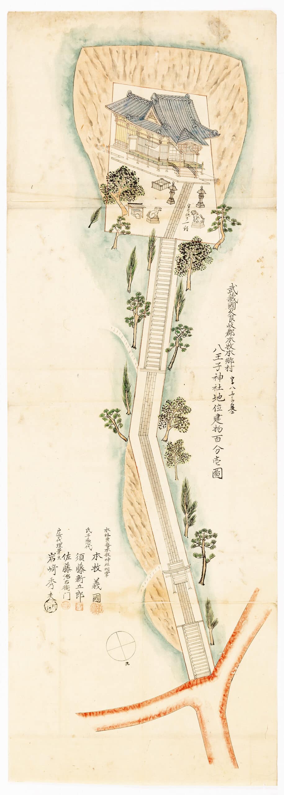 Let us begin with technique: the work appears to employ China ink alongside a water-based medium for the application of colour. The ink was likely applied using fine-tipped nibs or small brushes, depending on the subject depicted. The shrine itself is rendered with a striking level of detail, a quality made possible by the large format of the drawing. Broader brushes, by contrast, seem to have been used to fill in the shaded greens surrounding the hilltop where the shrine stands, the rocky textures, and selected areas of the roof, vegetation, and paving. Over time, the ink has undergone slight discolouration, turning reddish in certain areas. The colours have also lost some of the original saturation. The streets at the bottom are deliberately rendered in red, marking them as access routes rather than sacred spaces and thus distinguishing them through a different chromatic approach. The paper itself shows folds and signs of deterioration, lending the drawing an appearance that may seem older than it actually is.