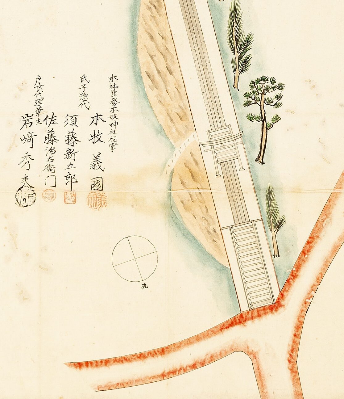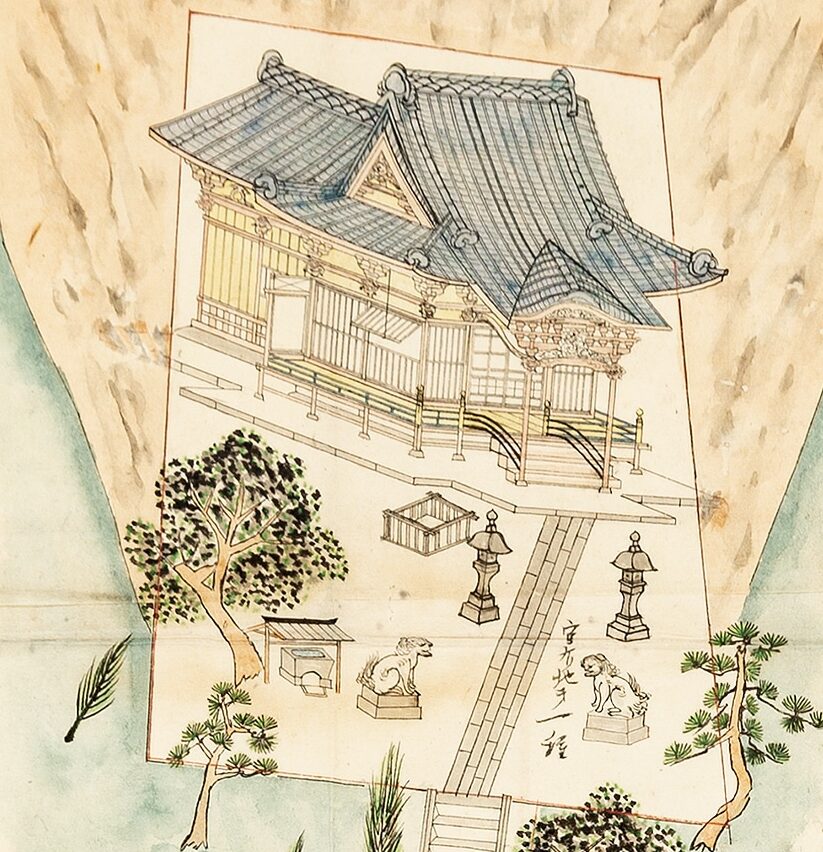This drawing by an unknown author can be appreciated from two different perspectives. On the one hand, it depicts a jinja, a Japanese Shinto shrine. From a historical point of view, the image can be read as an ezu—an illustrated map from the late Edo period (mid-nineteenth century)—featuring premodern calligraphy and the characteristic red hanko seals. The shrine is situated at the top of a hill, accessible via the sandō, an uphill path symbolising purification. As has been observed, ‘most Shinto shrines are located on lonely summits or on remote slopes of the mountains […] The shrines are not places for propaganda or evangelism, but are primarily sacred dwellings for kami (deities of nature).’[1] On the other hand, the drawing can be approached from a perspective closely aligned with architectural representation and graphic technique. These elements, although historical, are more accessible to a Western observer unfamiliar with Japanese traditions.