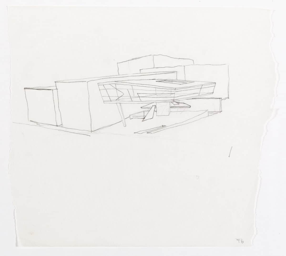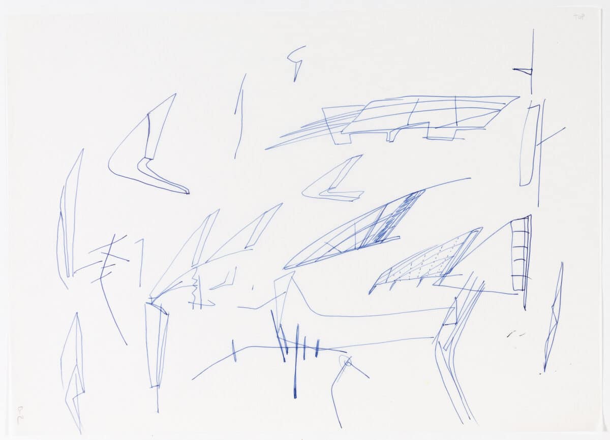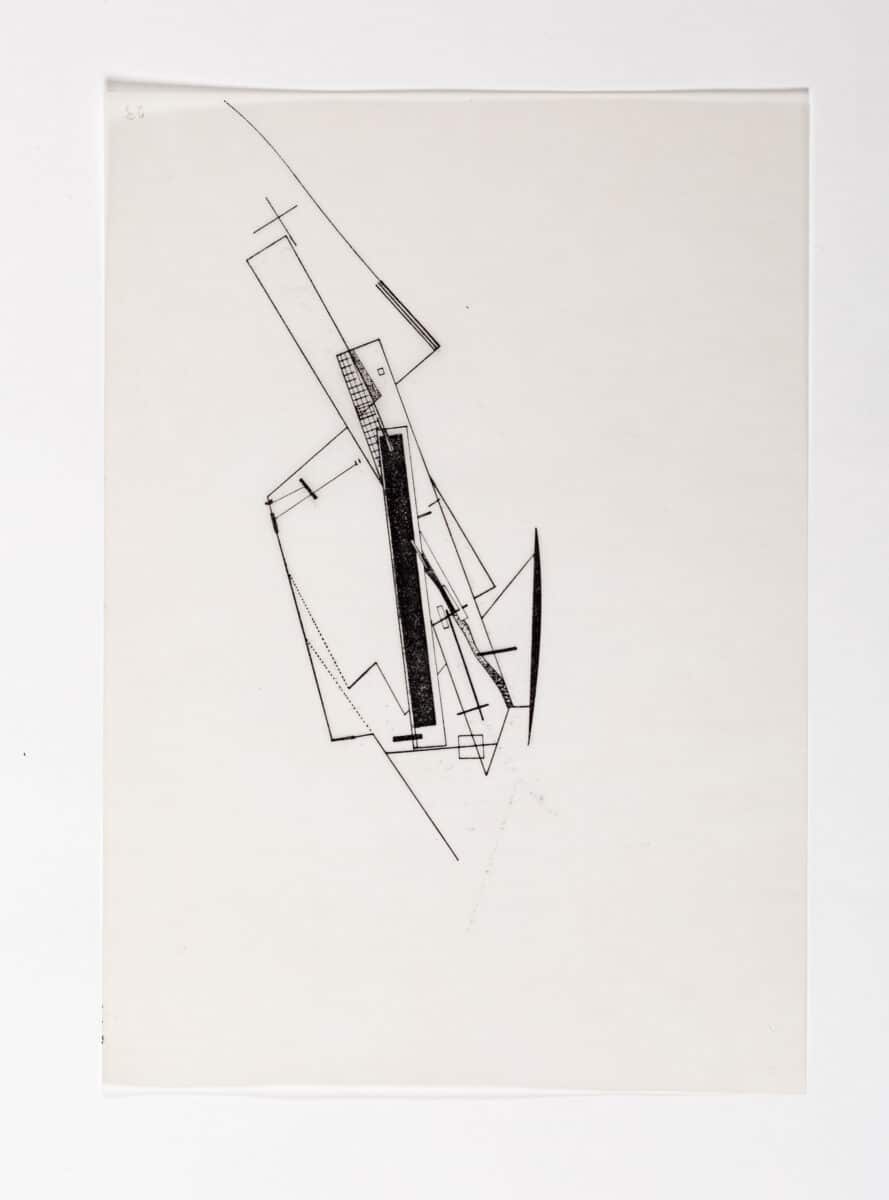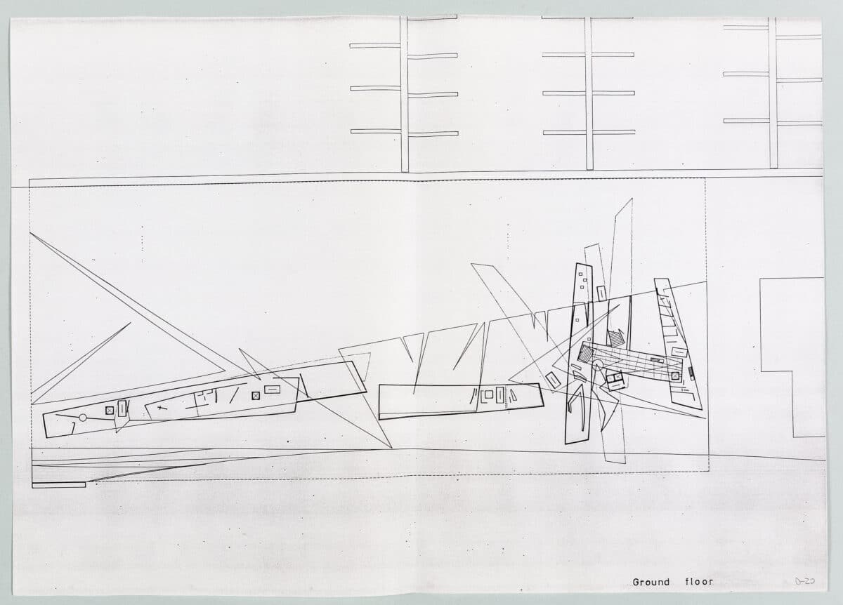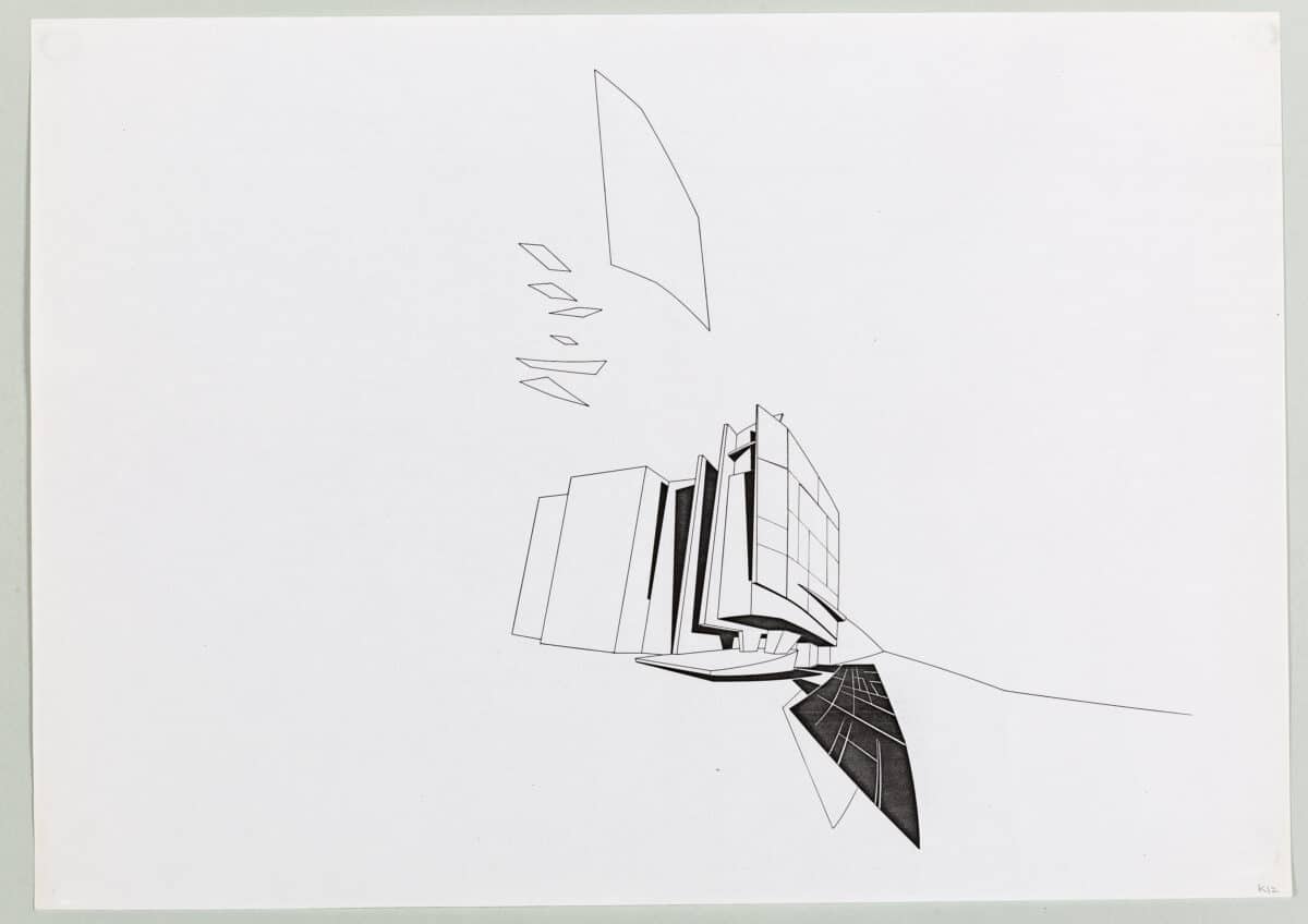A set of thirteen trace overlays made as an ‘information package’ for the Peak, a club perched in the Kowloon mountains above the city of Hong Kong. The building is layered horizontally, where angular cutting forms create a ‘suprematist geology’. Hadid wanted to form a new topography, excavating the hills for her ‘man-made geology’. Overlaid, the drawings show the shifting nature of the building’s angular planes, but individually they are dynamic compositions, shard-like fragments of a building splintering apart. This is exemplified through their sprawling lines and dashes, what Hadid called ‘tic-tic’, representing elements with the potential of movement. Hadid’s entry to the Peak Leisure Club won, but was never built; it was a pivotal project in the formation of Hadid’s oeuvre.
