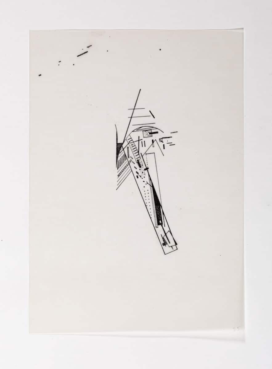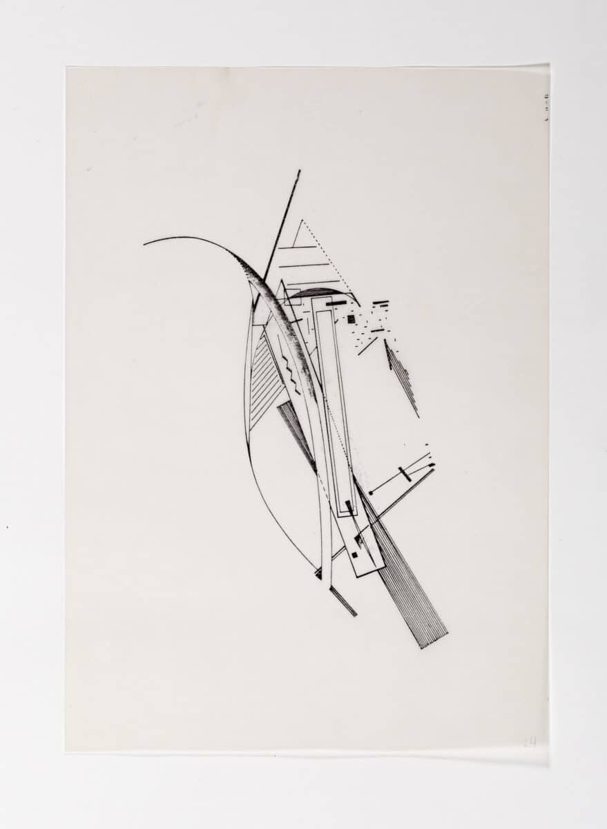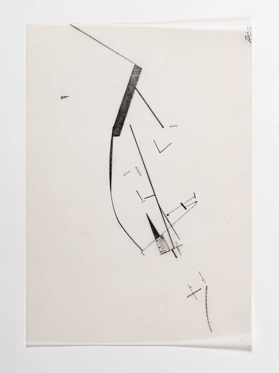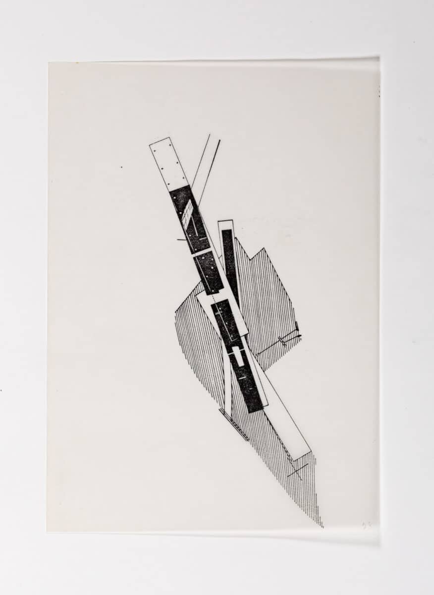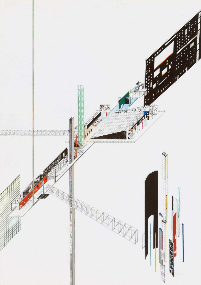 A set of thirteen trace overlays made as an ‘information package’ for the Peak, a club perched in the Kowloon mountains above the city of Hong Kong. The building is layered horizontally, where angular cutting forms create a ‘suprematist geology’. Hadid wanted to form a new topography, excavating the hills for her ‘man-made geology’. Overlaid, the drawings show the shifting nature of the building’s angular planes, but individually they are dynamic compositions, shard-like fragments of a building splintering apart. This is exemplified through their sprawling lines and dashes, what Hadid called ‘tic-tic’, representing elements with the potential of movement. Hadid’s entry to the Peak Leisure Club won, but was never built; it was a pivotal project in the formation of Hadid’s oeuvre.