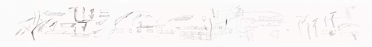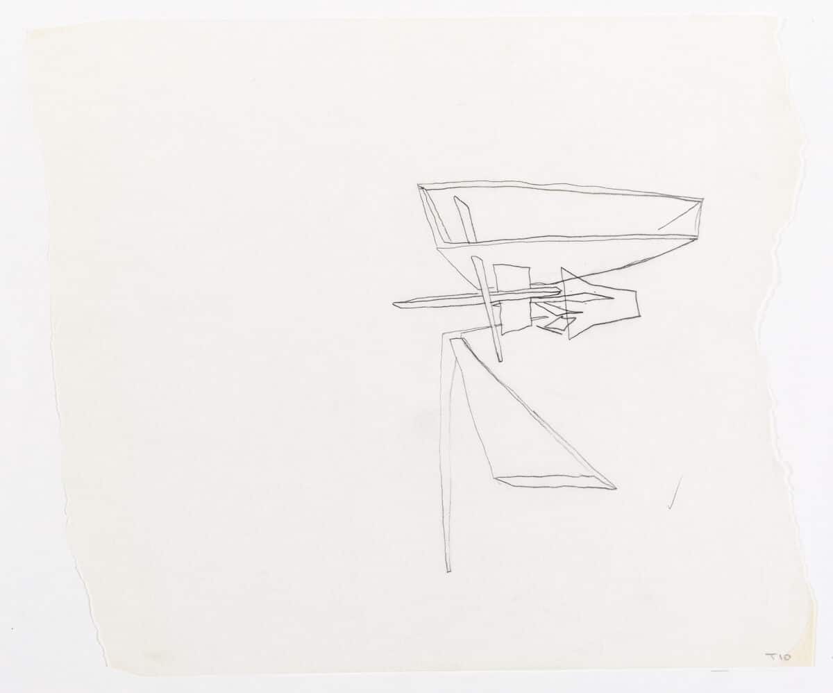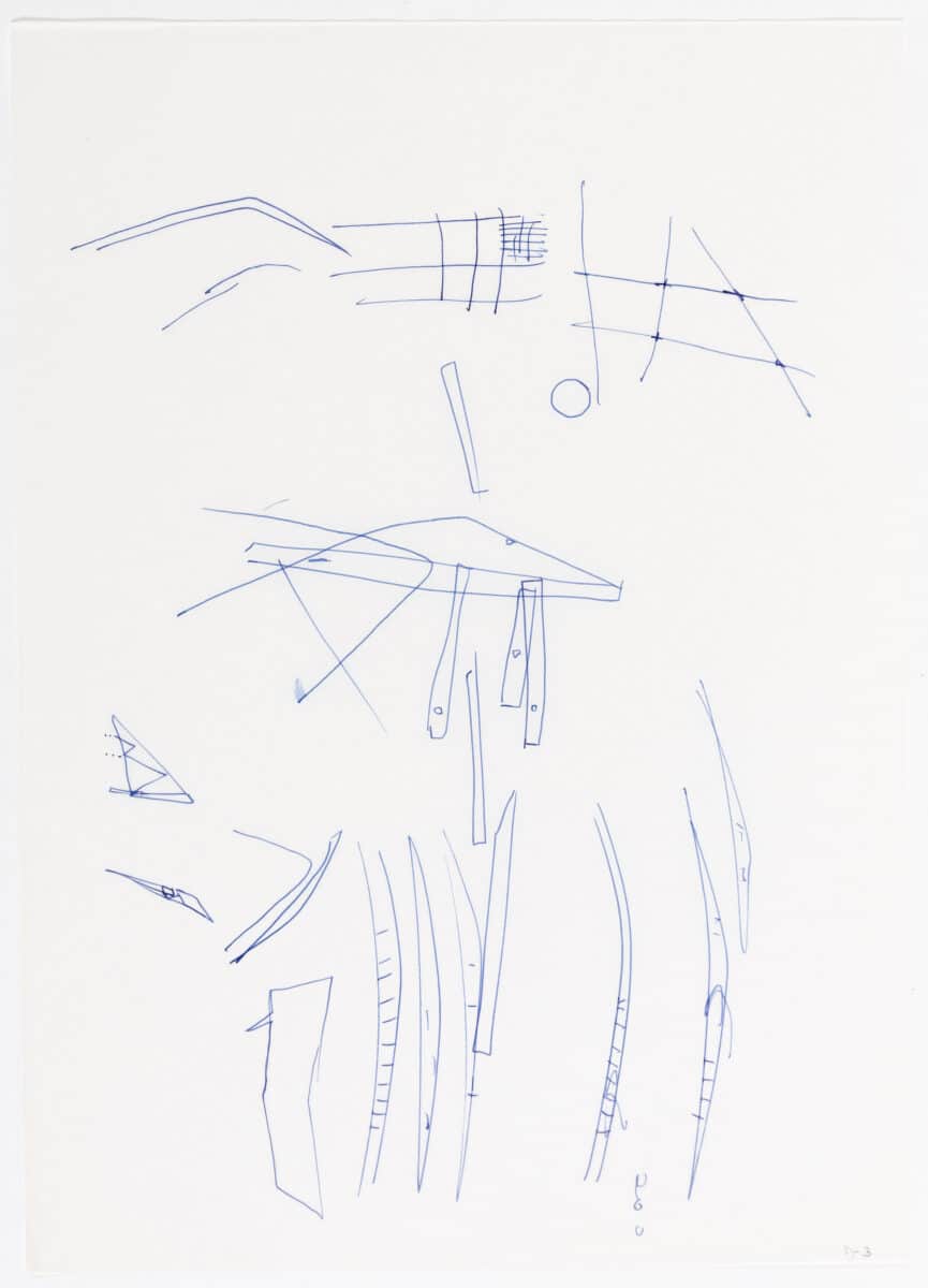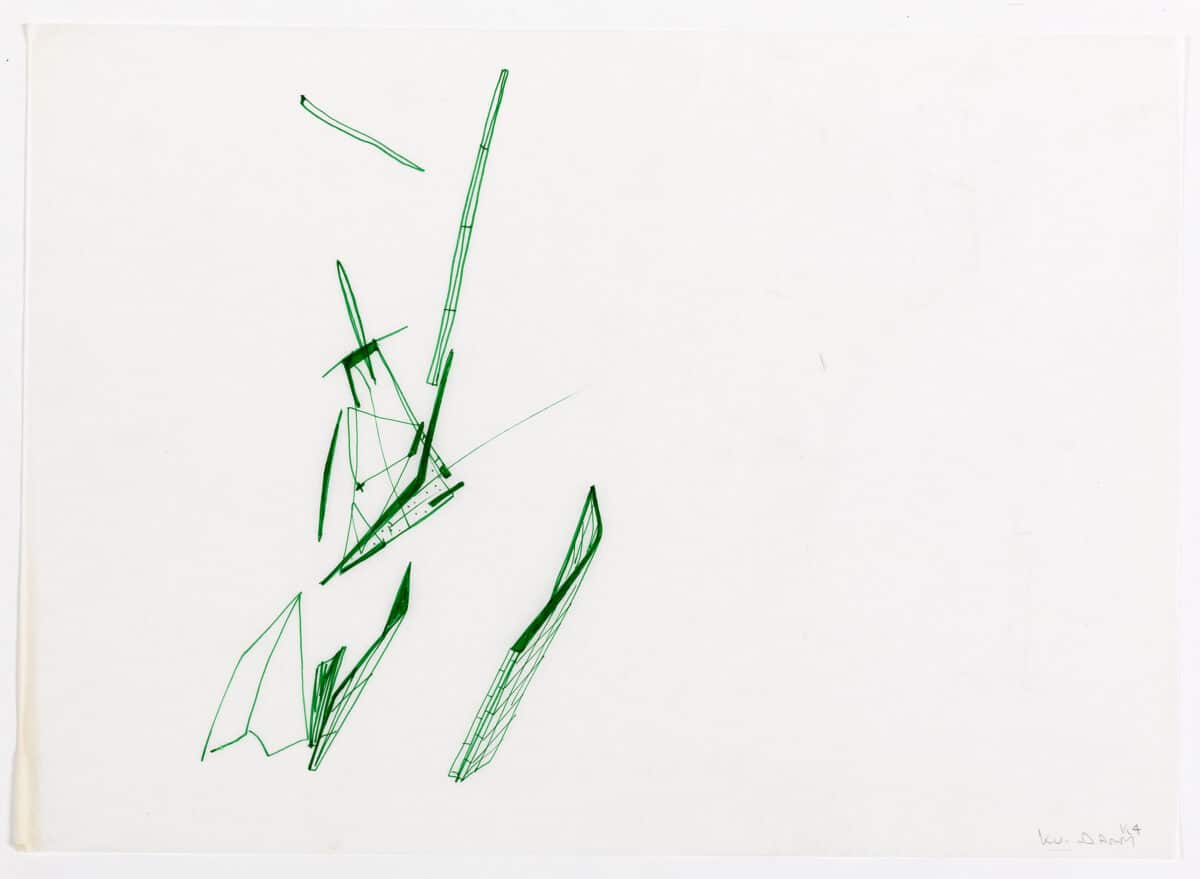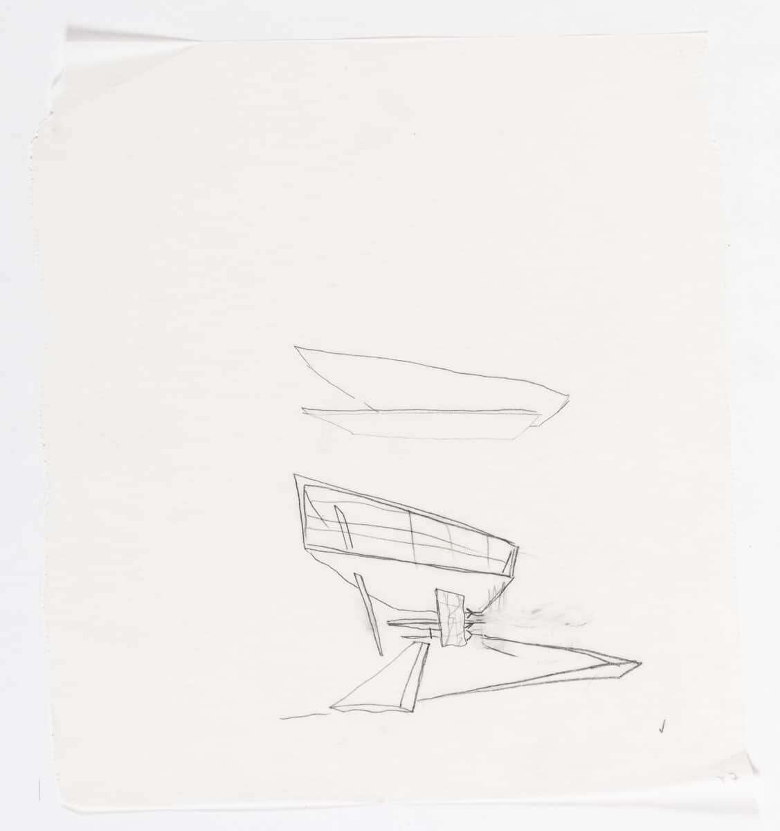 A set of thirteen trace overlays made as an ‘information package’ for the Peak, a club perched in the Kowloon mountains above the city of Hong Kong. The building is layered horizontally, where angular cutting forms create a ‘suprematist geology’. Hadid wanted to form a new topography, excavating the hills for her ‘man-made geology’. Overlaid, the drawings show the shifting nature of the building’s angular planes, but individually they are dynamic compositions, shard-like fragments of a building splintering apart. This is exemplified through their sprawling lines and dashes, what Hadid called ‘tic-tic’, representing elements with the potential of movement. Hadid’s entry to the Peak Leisure Club won, but was never built; it was a pivotal project in the formation of Hadid’s oeuvre.