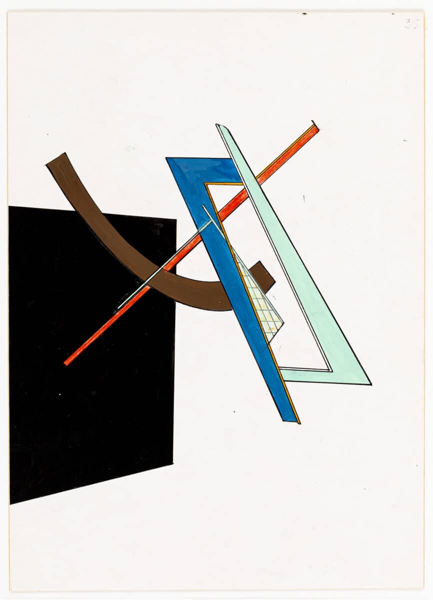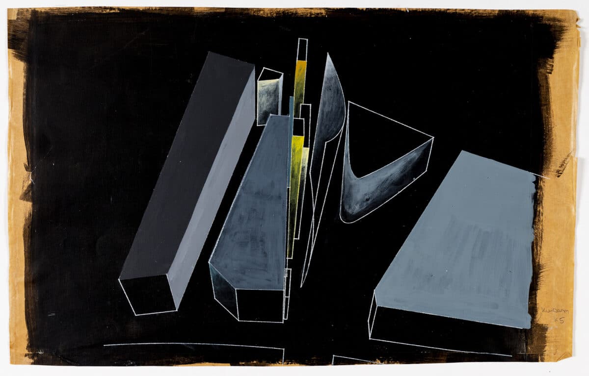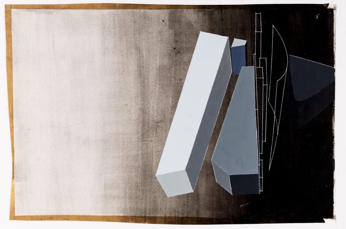 Four painted sketches for the Irish Prime Minister’s Residence (also referred to as the Taoiseach’s new residence). The competition, although not won, marked Hadid’s formation of her own office in 1979 after leaving OMA. It was for a new residence and state guest house in Phoenix Park, Dublin. With the four coloured sketches matching perfectly the composition of drawings in a sketchbook held at the Zaha Hadid Foundation archive, it has been suggested that the pages were photocopied and then hand coloured, presumably for the purpose of sale as works of art; the date of the drawings coincides with her first solo exhibition at the Galerie Van Rooy in Amsterdam.