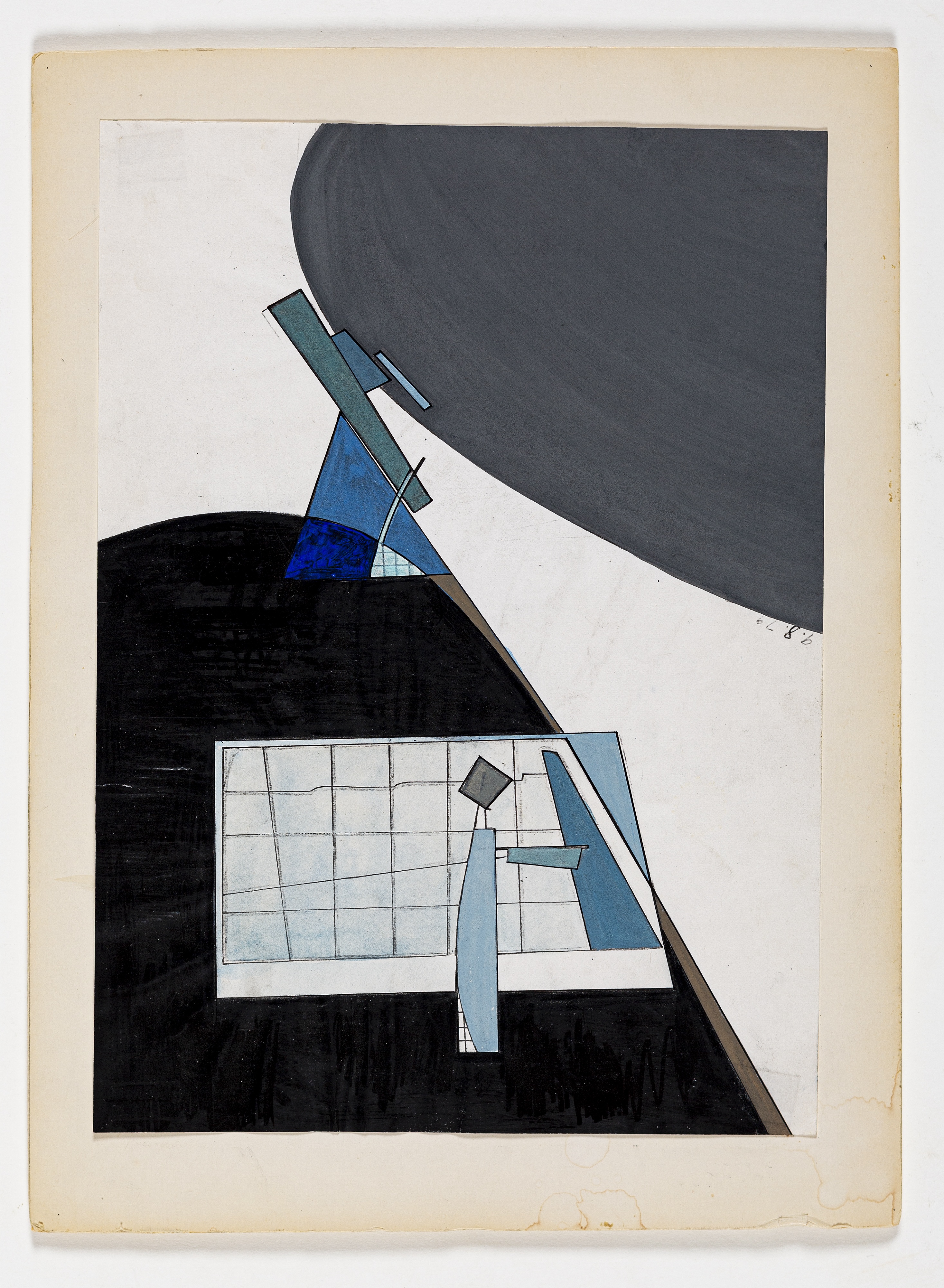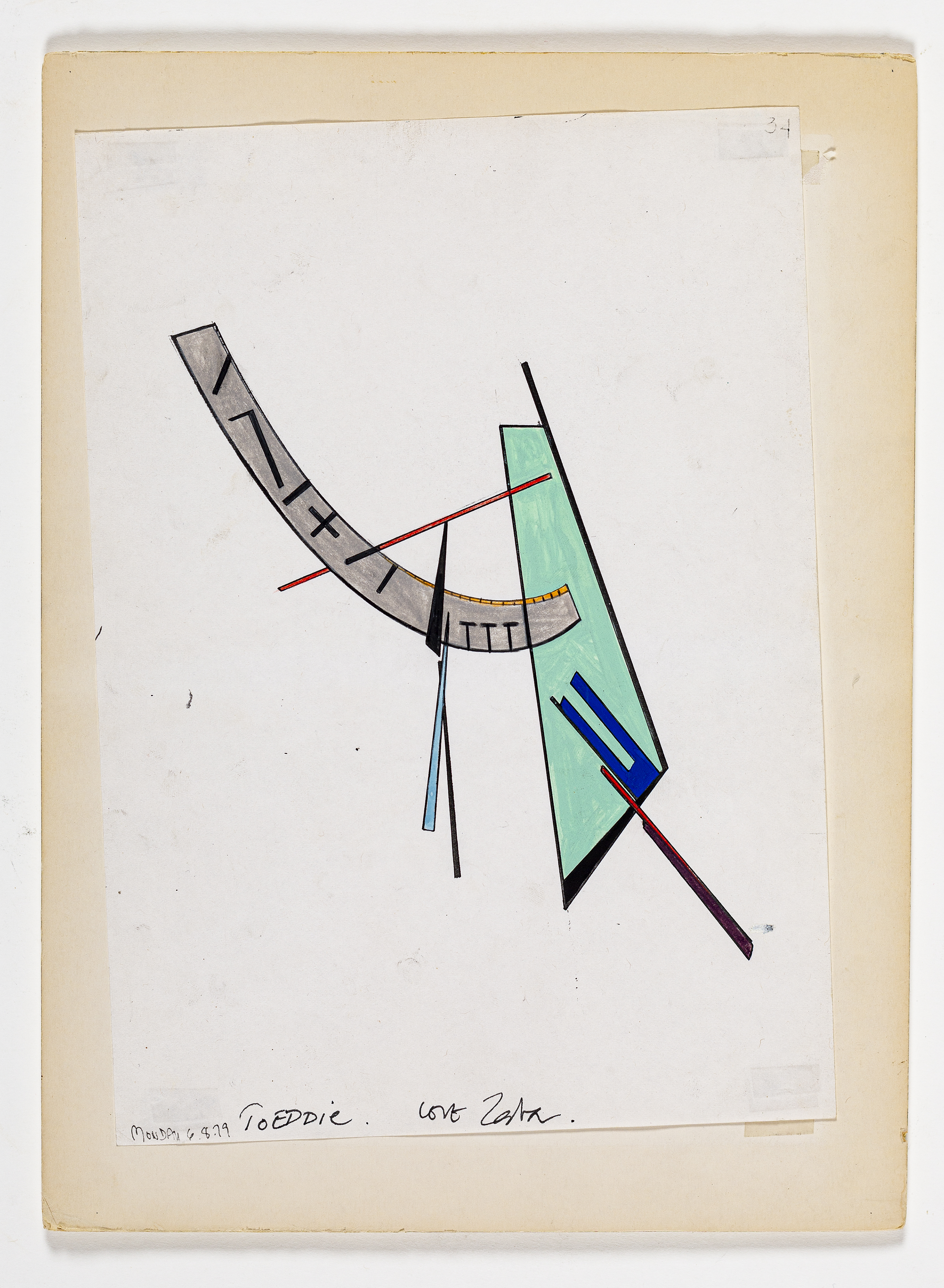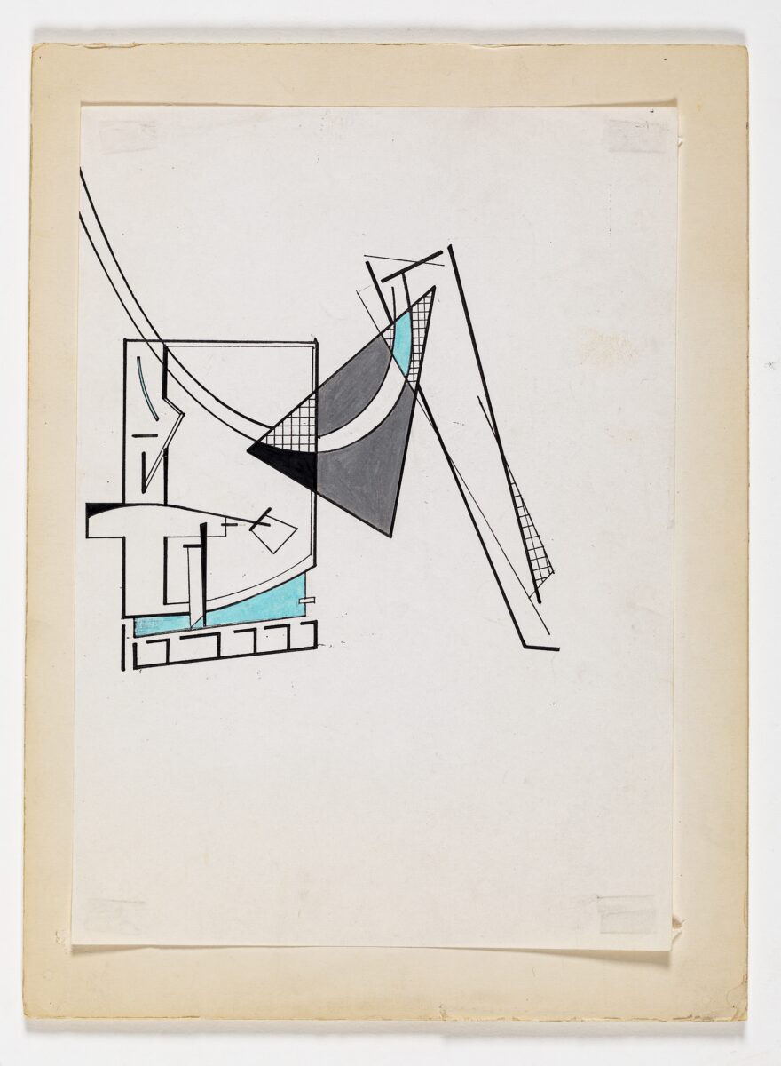 The material of Zaha Hadid held at Drawing Matter comes primarily from Michael Wolfson, with a few additional pieces from Jeremy Peacock. Wolfson studied under Hadid at the AA in London, going on to work for her until 1991, although he collaborated on later projects. The majority of the works of Hadid reside with the Zaha Hadid Foundation, with other projects, paintings, or competition entries distributed sporadically across the world. The Phaeno Science Centre’s (1996-2015) digital project records are held at the Canadian Centre for Architecture; The Great Utopia exhibition design materials from the Guggenheim in New York, are held at the Getty Institute; some early works and paintings are in the collection of the Boyarsky family; with other works held by the AA, MAK, MAXXI, and the Berlinische Galerie, among others.