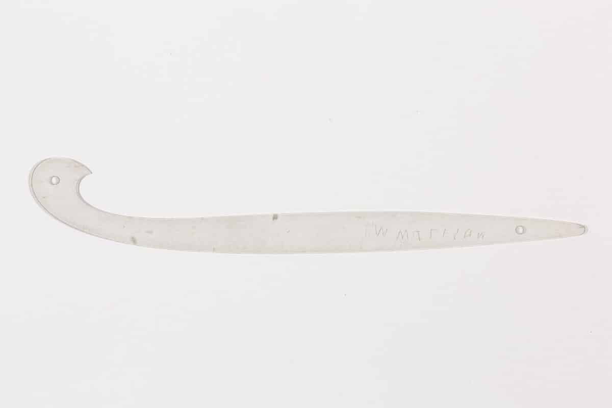 In many early works, Hadid employed the arced edge of a ship’s curve or French curve to create strong bowed lines. Wolfson recounts travelling to Paris with Hadid, where they purchased this acrylic French curve. It includes a hole at one end for pinning the tool to a drawing board.
