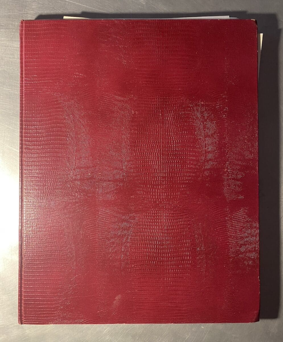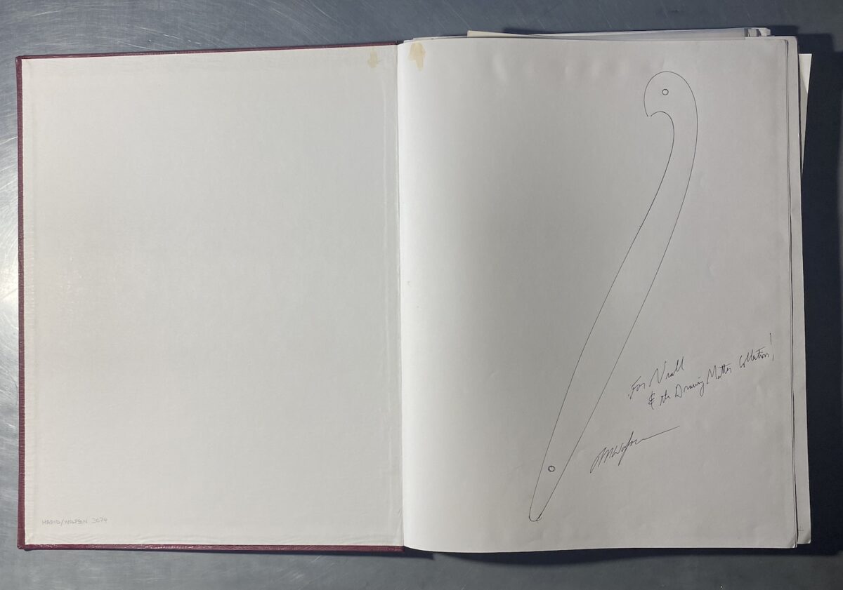 Red Snakeskin leather-bound sketchbook in which all drawings acquired from Michael Wolfson arrived. Now only contains the xerox prints of Zollhof 3 Media Park, Tomigaya, and Kurfürstendamm. Opens with a stencil of the French curve and a dedication from Michael Wolfson to Drawing Matter.
