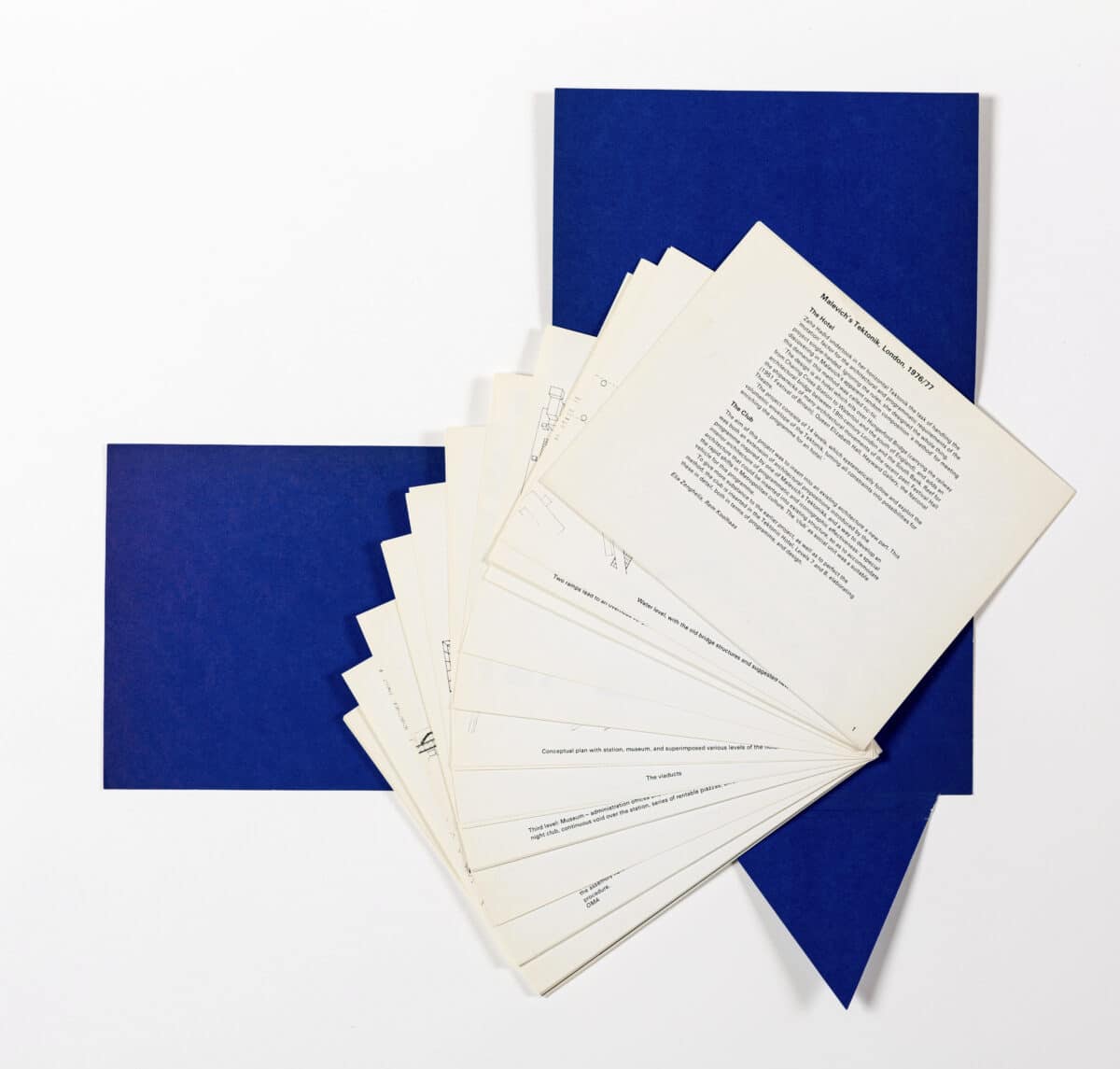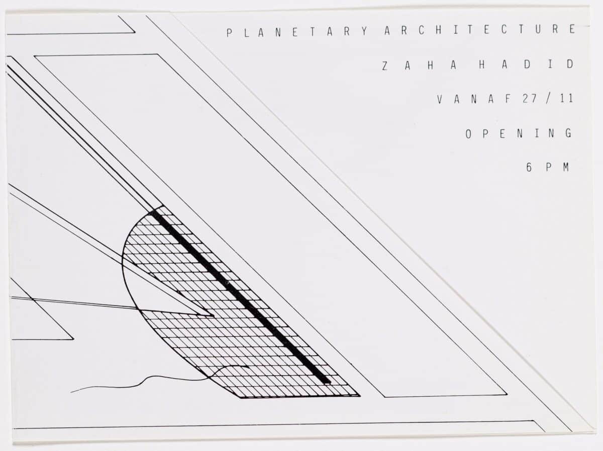 Exhibition catalogue for Planetary Architecture at the Van Rooy Gallery in Amsterdam of Hadid’s early works, comprised of 78 individual sheets. The sheets run through five projects, with introductory information, a series of drawings, and a credit sheet. It opens with Hadid’s student projects Malevich’s Tektonik (1976-77), The Museum of the 19th Century (1977-78), followed by The Extension to the Dutch Parliament (1978-79), Irish Prime Minister’s Residence (1979-80), and 59 Eaton Place (1980-81).