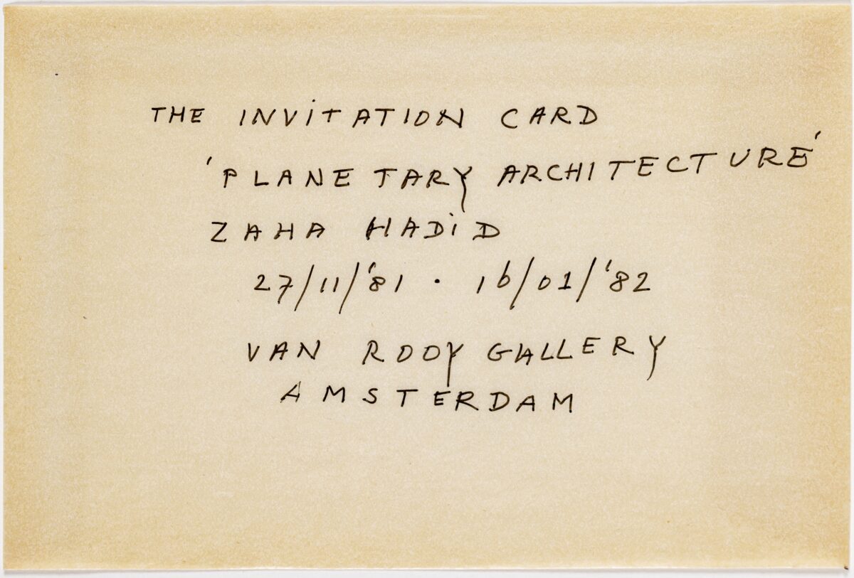 Private view invitation and six polaroids of Planetary Architecture held at the Van Rooy Gallery in Amsterdam from the 27th November 1981 to the 16th January 1982. The exhibition was Hadid’s first solo show and only the ninth exhibition to be held at the Van Rooy Gallery. Hadid’s work on show wanted to explore the spatial potential of architecture; she equally designed the space with a gold rotating column and a wall of gridded lights. The polaroids mainly show the space, but one image does feature a photo of Hadid’s 59 Eaton Place project from 1980.