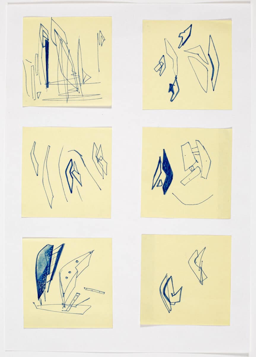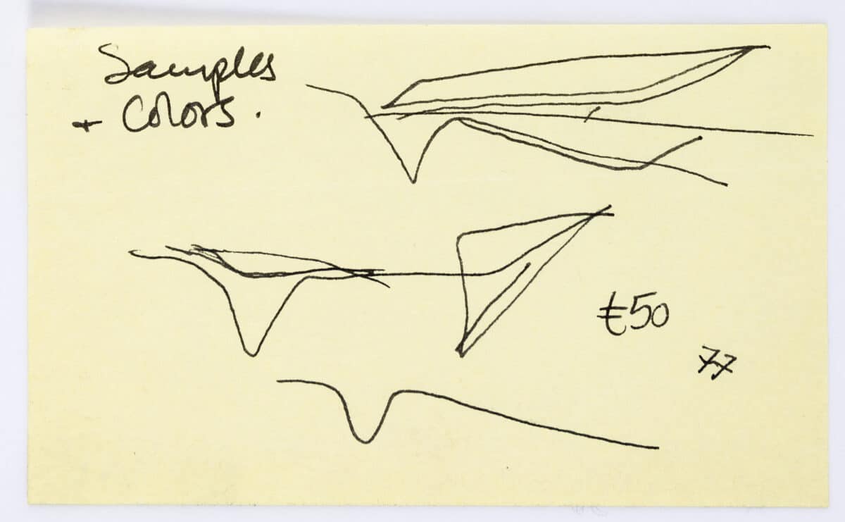Twelve post-it note development sketches of the Wavy Sofa. It was part of a suite of furniture commissioned in 1985 by furniture importer William Bitar for his townhouse at 24 Cathcart Road, London. The realised suite also contained the Metal Carpet, the Sperm Coffee Table, the Whoosh Sofa, and a sliding storage unit. The Wave Sofa was made of intersecting moulded fibreglass frames. Hadid, describing the work in 1987, stated ‘the sofa is not just a sofa, but also acts as a partition or shield.’ The sofa and its working drawings were exhibited at the AA in early 1988. When Bitar leaves his London house, the furniture is relocated to Hadid’s own apartment. Valerio Mazzei and Massimo Morozzi of the Italian furniture company Edra, see the sofas in an 1987 edition of Casa Vogue and enquire about the industrial production of them. The ‘Wave Collection’, a collaboration on three sofas between Hadid and Edra, was then launched at a Milan nightclub in September 1988, as part of the Milan Furniture Fair. The name of the sofa transitions from ‘Wavy’ to ‘Wave’ upon its production by Edra.