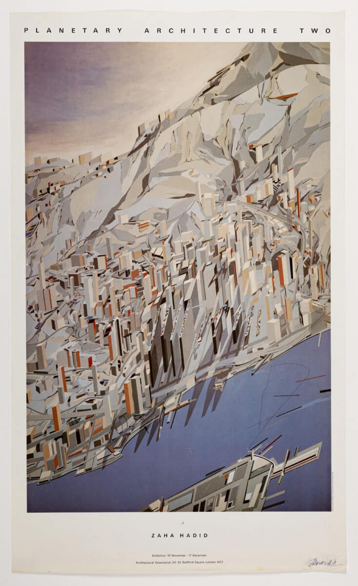 Poster for the exhibition Planetary Architecture Two at the Architectural Association, London. It features the painting for The Peak called ‘Blue Slabs’ and is signed by Hadid.