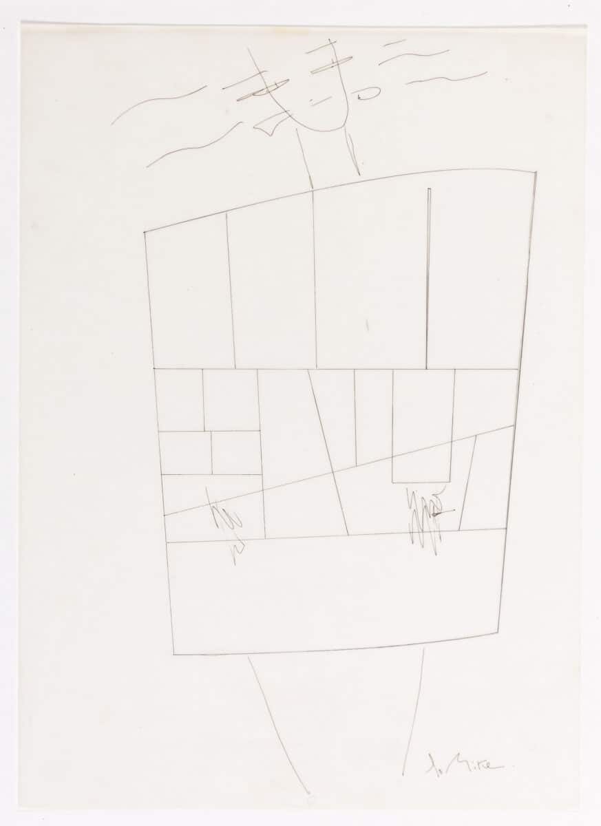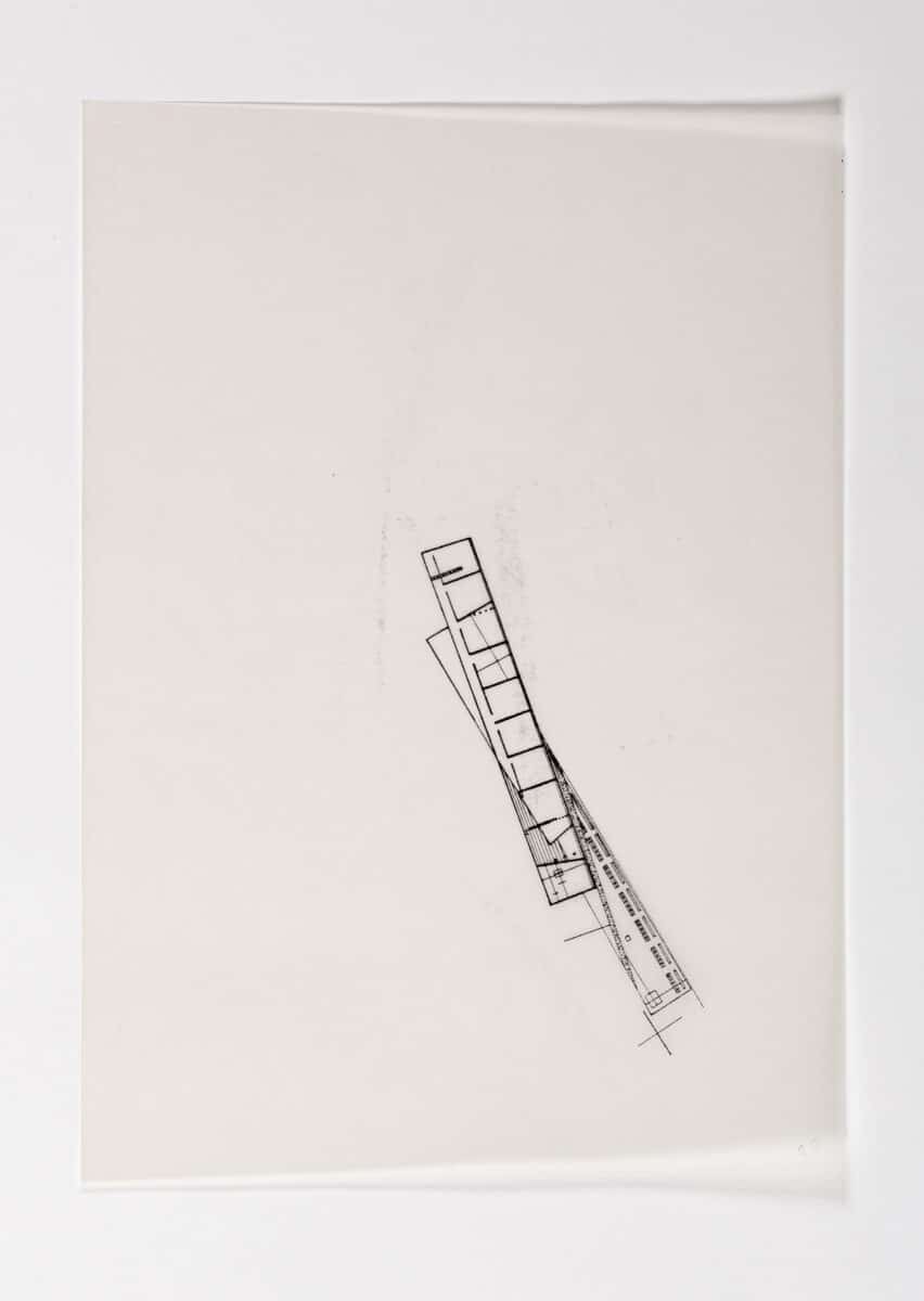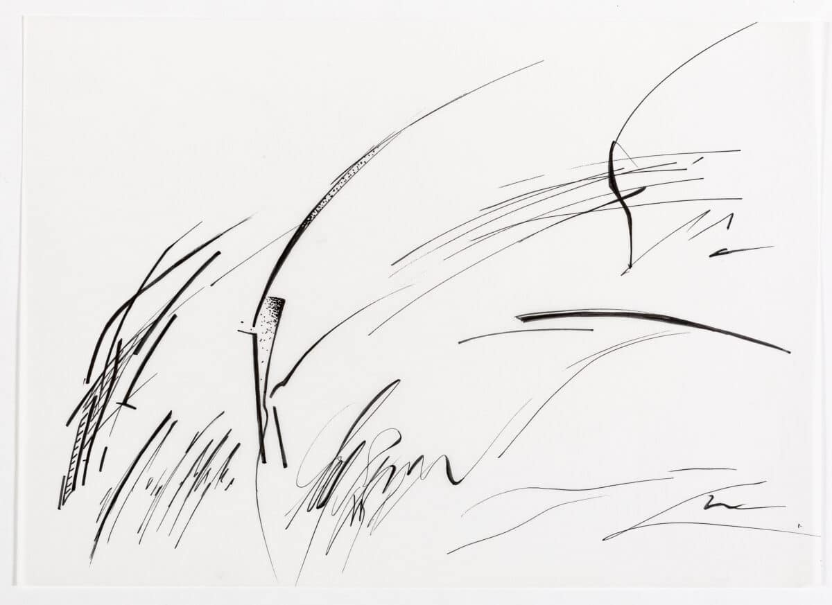 Ink on trace study for her later acrylic painting ‘The World (89 degrees)’, which was exhibited at her 1983 solo exhibition at the Architectural Association, Planetary Architecture Two. The painting is meant to represent all her key early works in the same field, while in Drawing Matter’s sketch no project is discernible; each grouping of lines carries the same arching curve that dominates the direction of the final painting. A version of the painting is featured on the folio cover for Planetary Architecture Two.