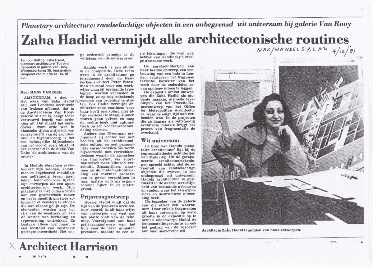 Photocopy of newspaper review for Planetary Architecture by Hans van Dijk published on the 4th December 1981. The article is written in Dutch and features a portrait of Hadid, with three of her paintings.