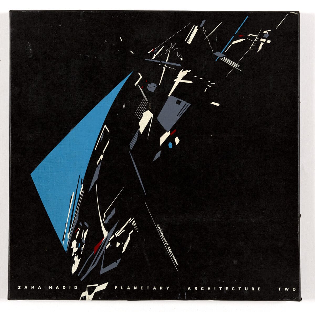 Boxed folio publication to coincide with the exhibition Planetary Architecture Two at the Architectural Association, London. The exhibition opened on the 18th November, 1983 for only a month. It features an introduction by Kenneth Frampton and an interview between Zaha Hadid and former AA director, Alvin Boyarsky, followed by 18 individual sheets of her works from Malevich’s Tektonik (1976-77) and The Museum of the 19th Century (1977-78), to the Irish Prime Minister’s Residence (1979-80), 59 Eaton Place (1980-81), Parc de la Villette (1982), The Peak (1983), and ‘The World (89 degrees)’ (1983).