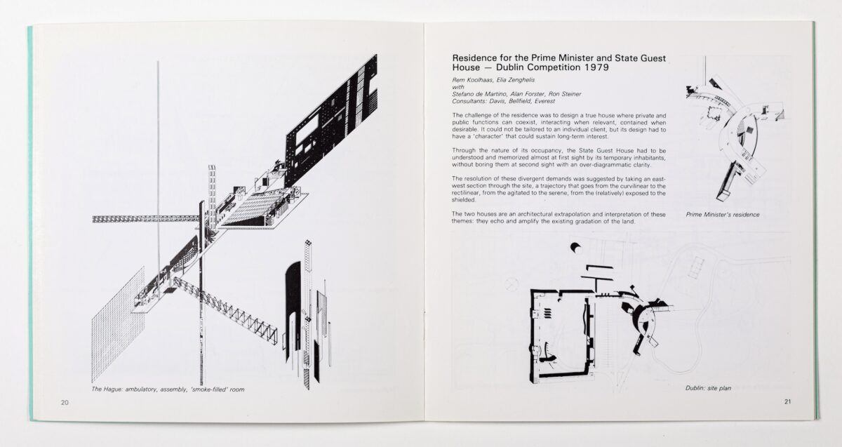 Catalogue published for the AA’s exhibition of OMA drawings in June 1981. It features Hadid, Koolhaas, and Zenghelis’ drawing for the Dutch Parliament (copy held in the Drawing Matter collection), alongside OMA’s rival competition entry for the Irish Prime Minister’s House, once Hadid had left the office.