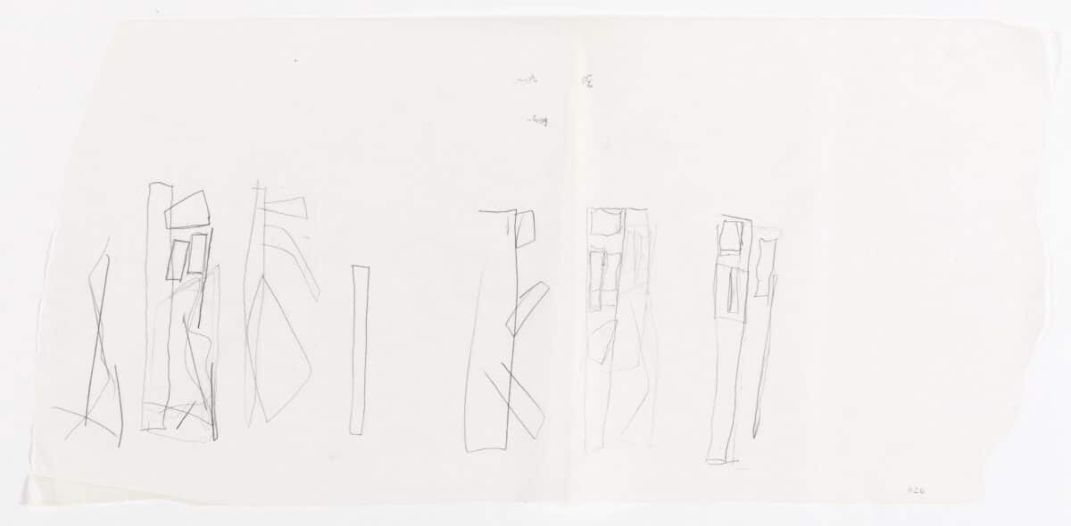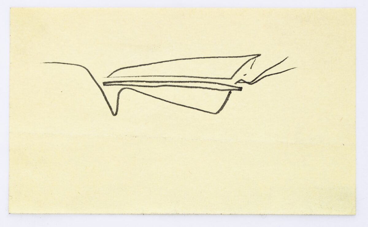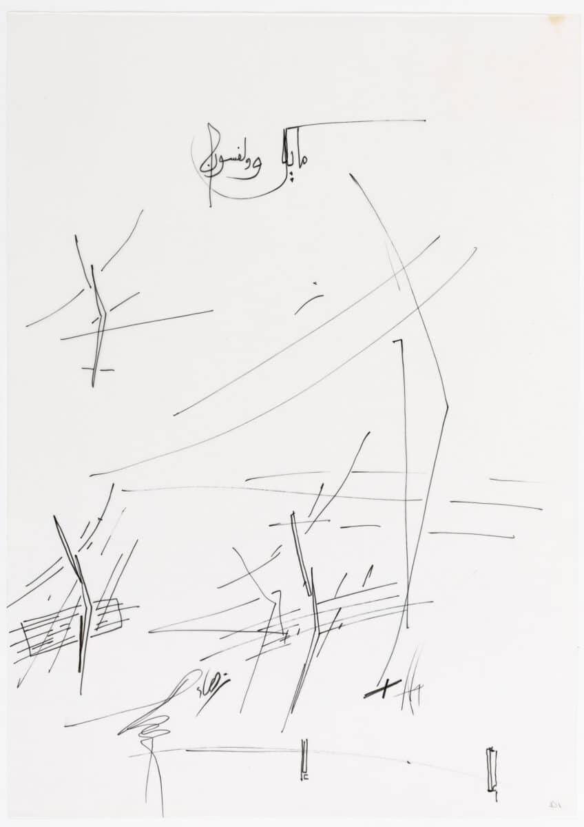 Eleven sketches on trace, post-it notes, and hotel stationery related to the Azabu-Juban office building project in Tokyo for the manufacturing company K-One Corporation. The project was unrealised but like many others of the time, tried to liberate space within a confined urban site. The sketches at Drawing Matter appear to focus on the project’s defining glass curtain walls. Among these sketches we find Hadid’s doodles including variations of calligraphic signatures in Arabic.