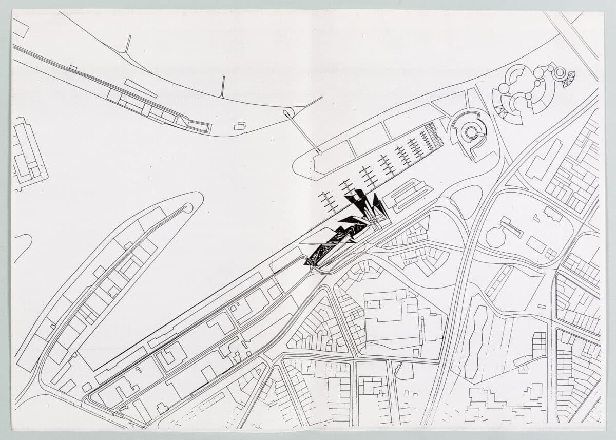 This sketch at Drawing Matter was regarded as part of the material for Zollhof 3 Media Park, but through comparison to works held at the ZHF and the Berlinische Galerie, we can see the similarity of the form to the Victoria City Areal. With this striking angular line and a cross, both emblematic of the Berlin project. The two projects are contemporaneous and speak to the recurring motif of shifting slabs in Hadid’s work at the time. Victoria City Areal was a project initiated by the Berlin Senate to redevelop the area between Kurfürstendamm and Kantstrasse. Hadid’s response to the project was praised but not chosen. The commercial development would encompass shops, office spaces, and hotels; Hadid’s design was for a nine-storey structure which emphasised the horizontality of the city. It was to encourage movement with services that offered permeability, divided by a network of walkways, ramps, and connections to transport hubs.